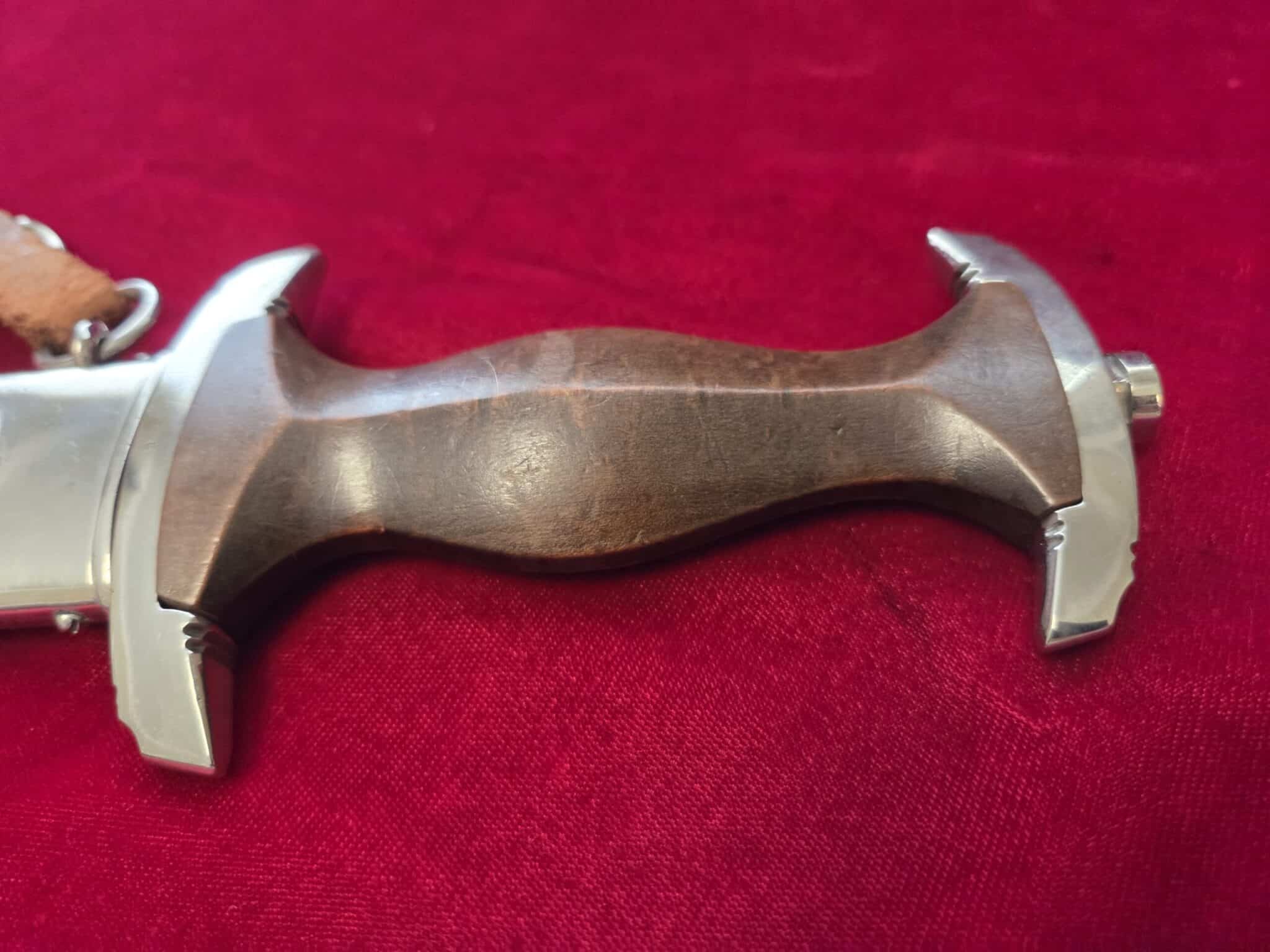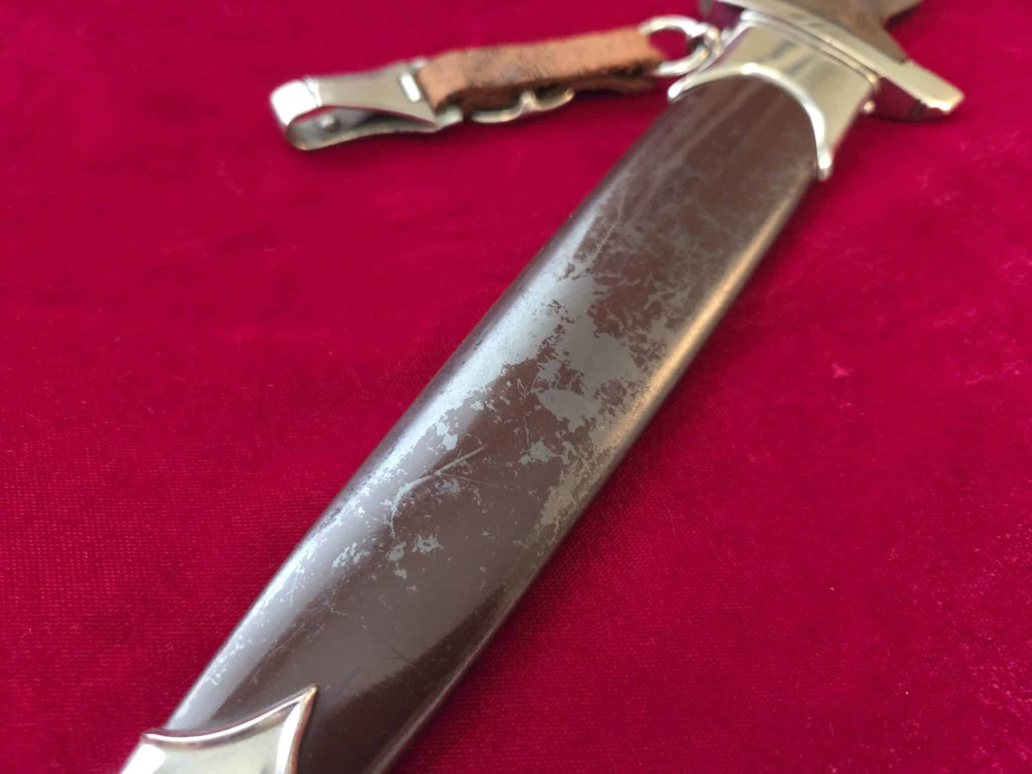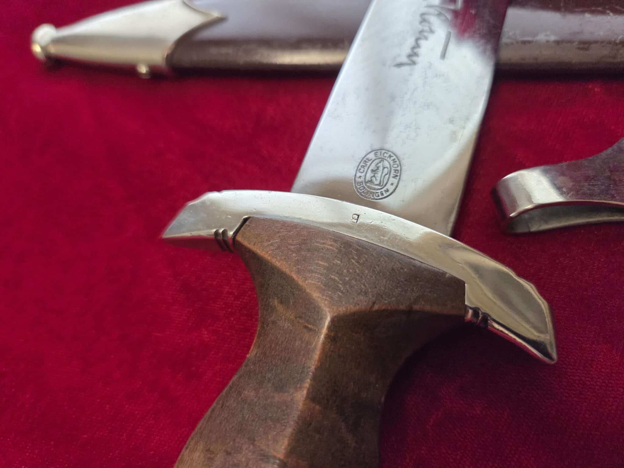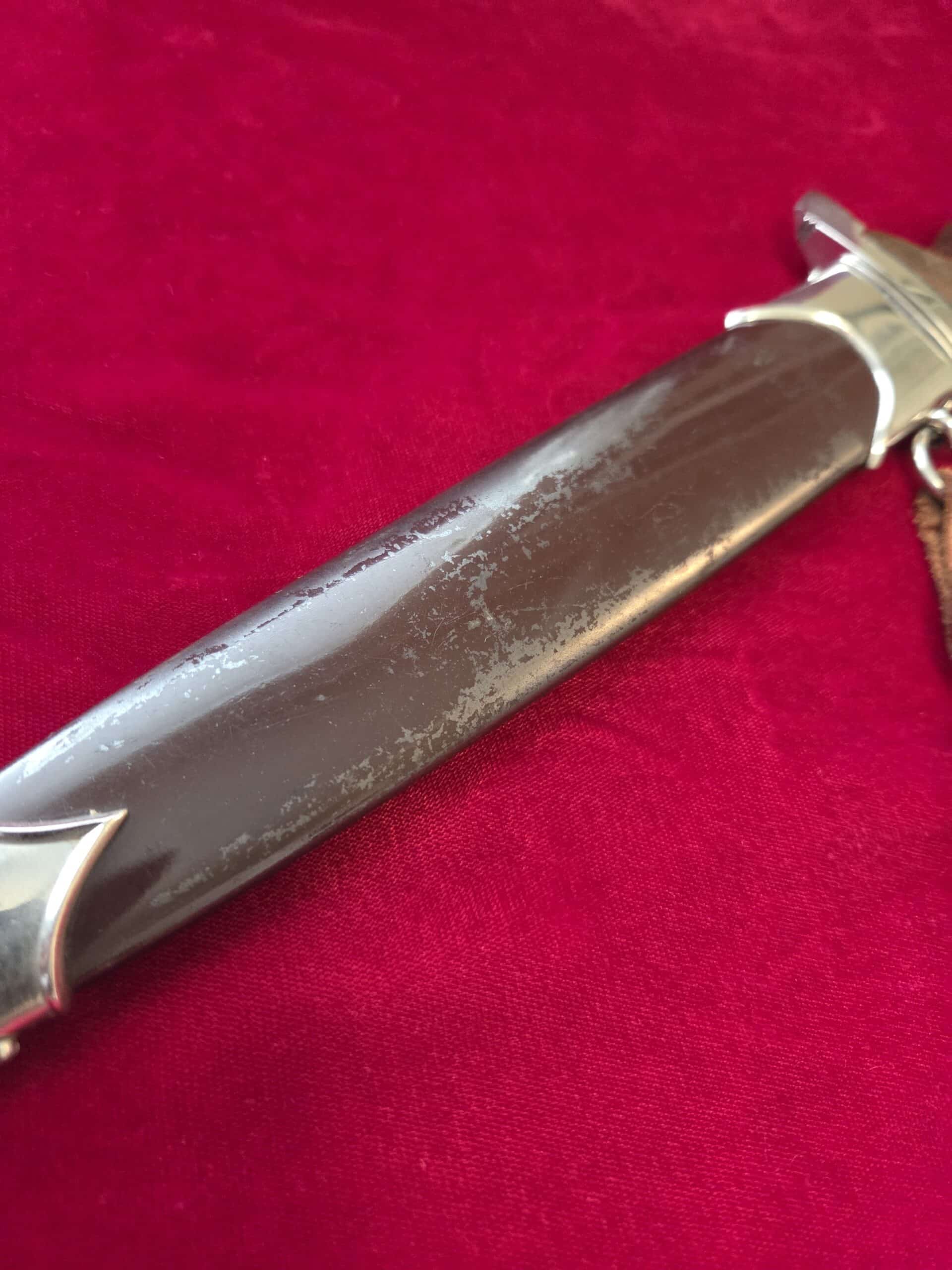 Carl Eickhorn – Solingen trademark. Nickel/silver crossguards with reverse side of lower crossguard marked with “B”. Light runner marks and speckling on blade but no nicks to cutting edge and tip remains intact. Scabbard is dent free with 50-55% of anodized finish with nickel fittings. Lower scabbard fitting shows some minor dings and one corner of ball looks to have been dropped and is slightly dented with a split in the corner of ball. Wooden grip is in EXC++/Near MINT condition and the nickel/silver eagle and SA inserts are properly set. Hanger leather is very worn but hanger clip works perfectly.