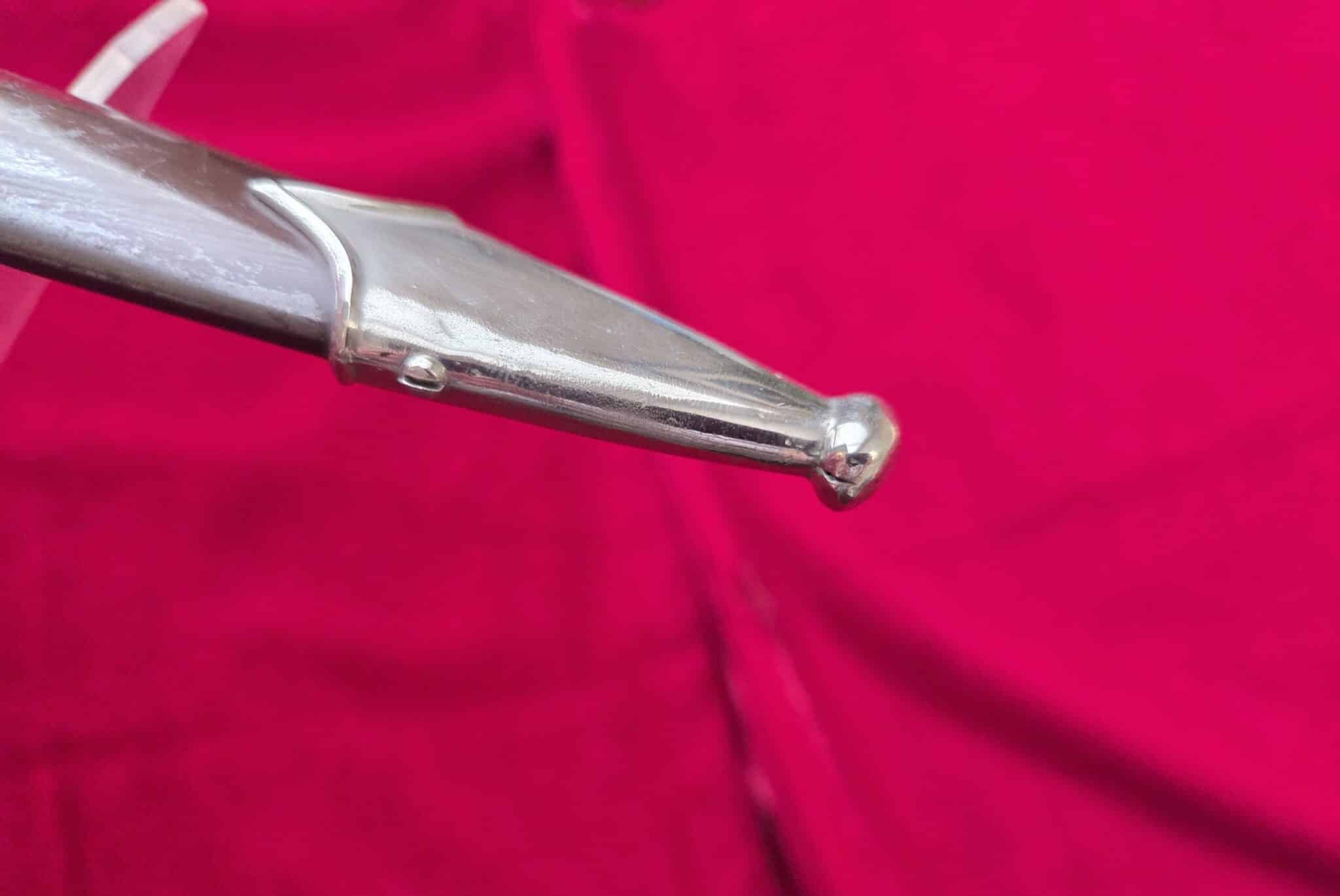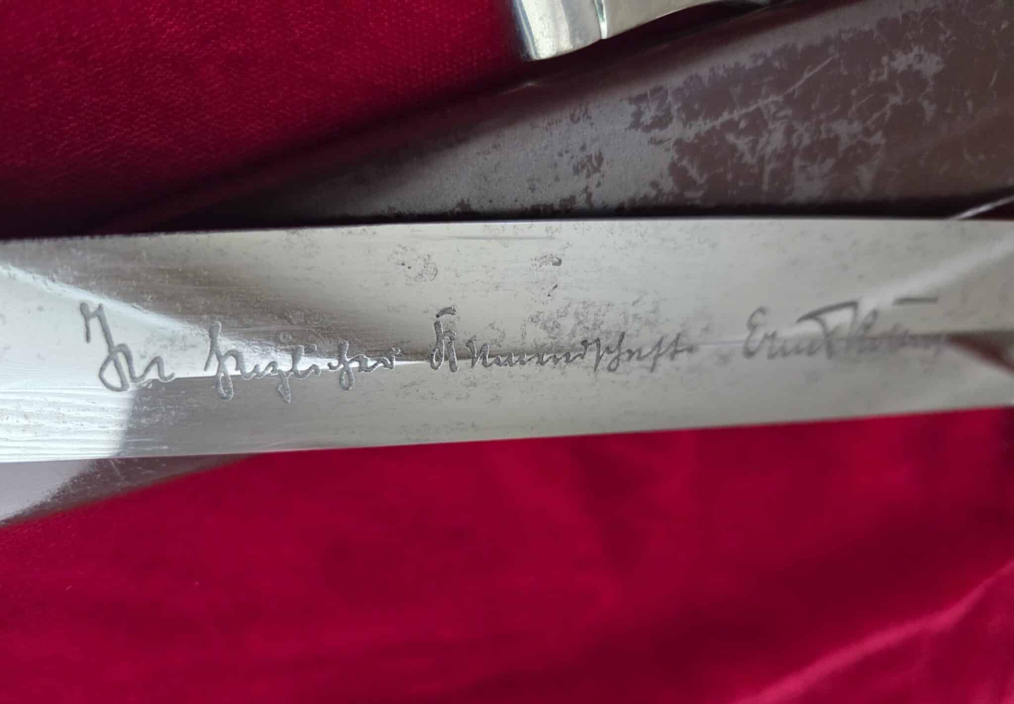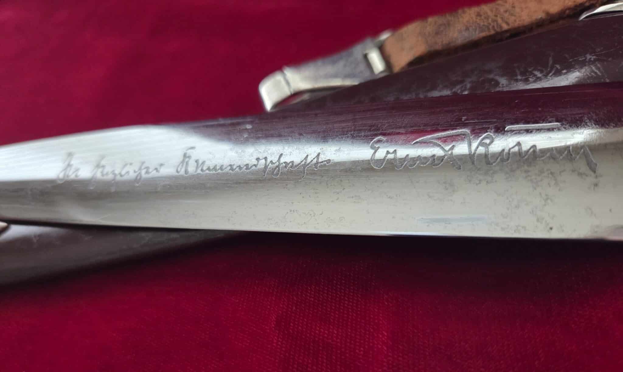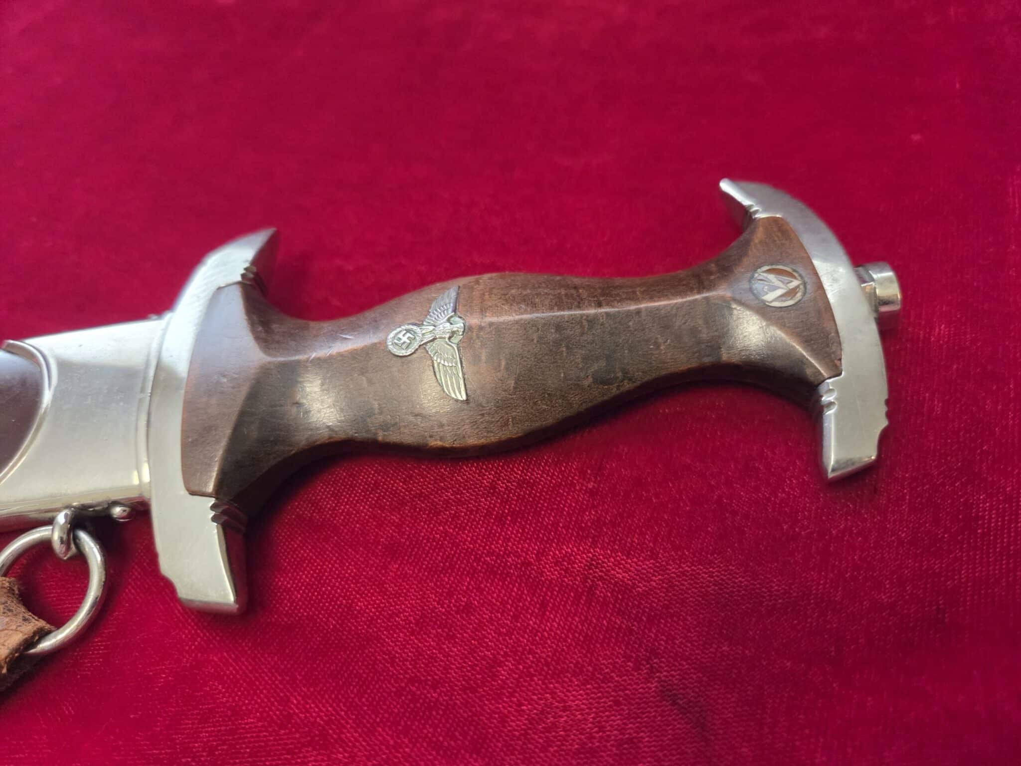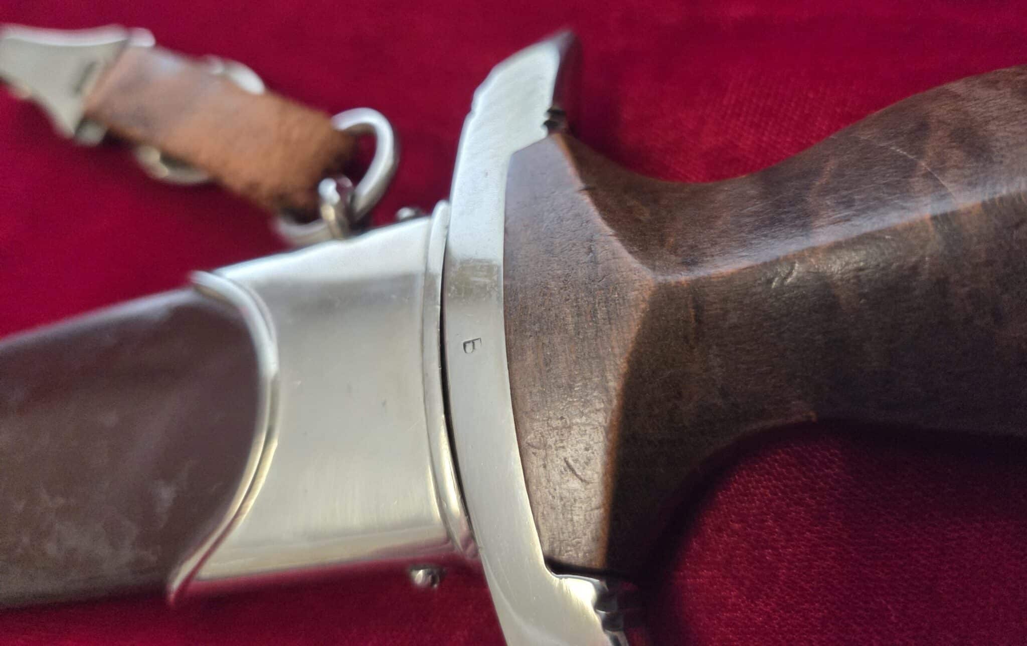 Carl Eickhorn – Solingen trademark. Nickel/silver crossguards with reverse side of lower crossguard marked with “B”. Light runner marks and speckling on blade but no nicks to cutting edge and tip remains intact. Scabbard is dent free with 50-55% of anodized finish with nickel fittings. Lower scabbard fitting shows some minor dings and one corner of ball looks to have been dropped and is slightly dented with a split in the corner of ball. Wooden grip is in EXC++/Near MINT condition and the nickel/silver eagle and SA inserts are properly set. Hanger leather is very worn but hanger clip works perfectly.
