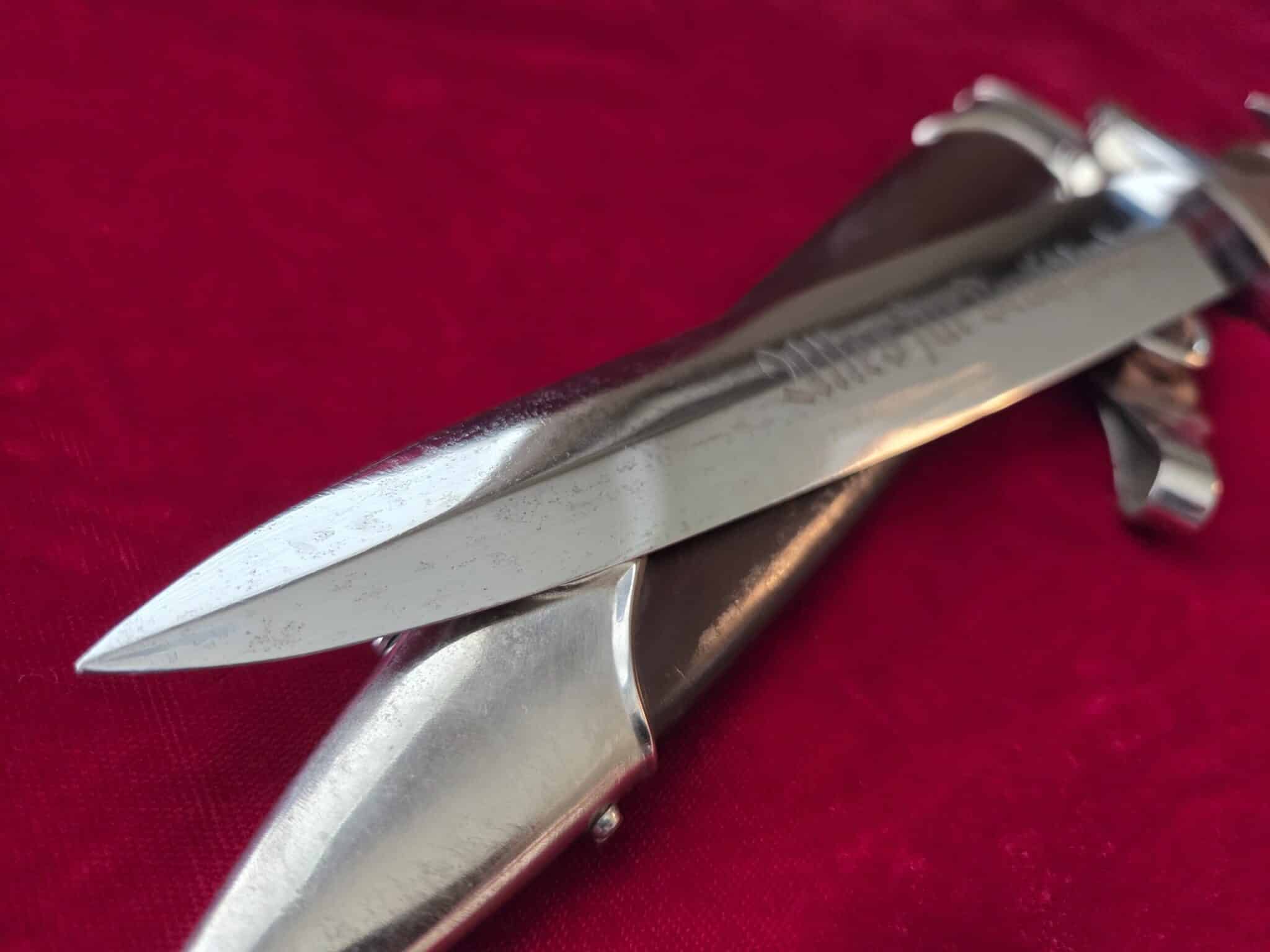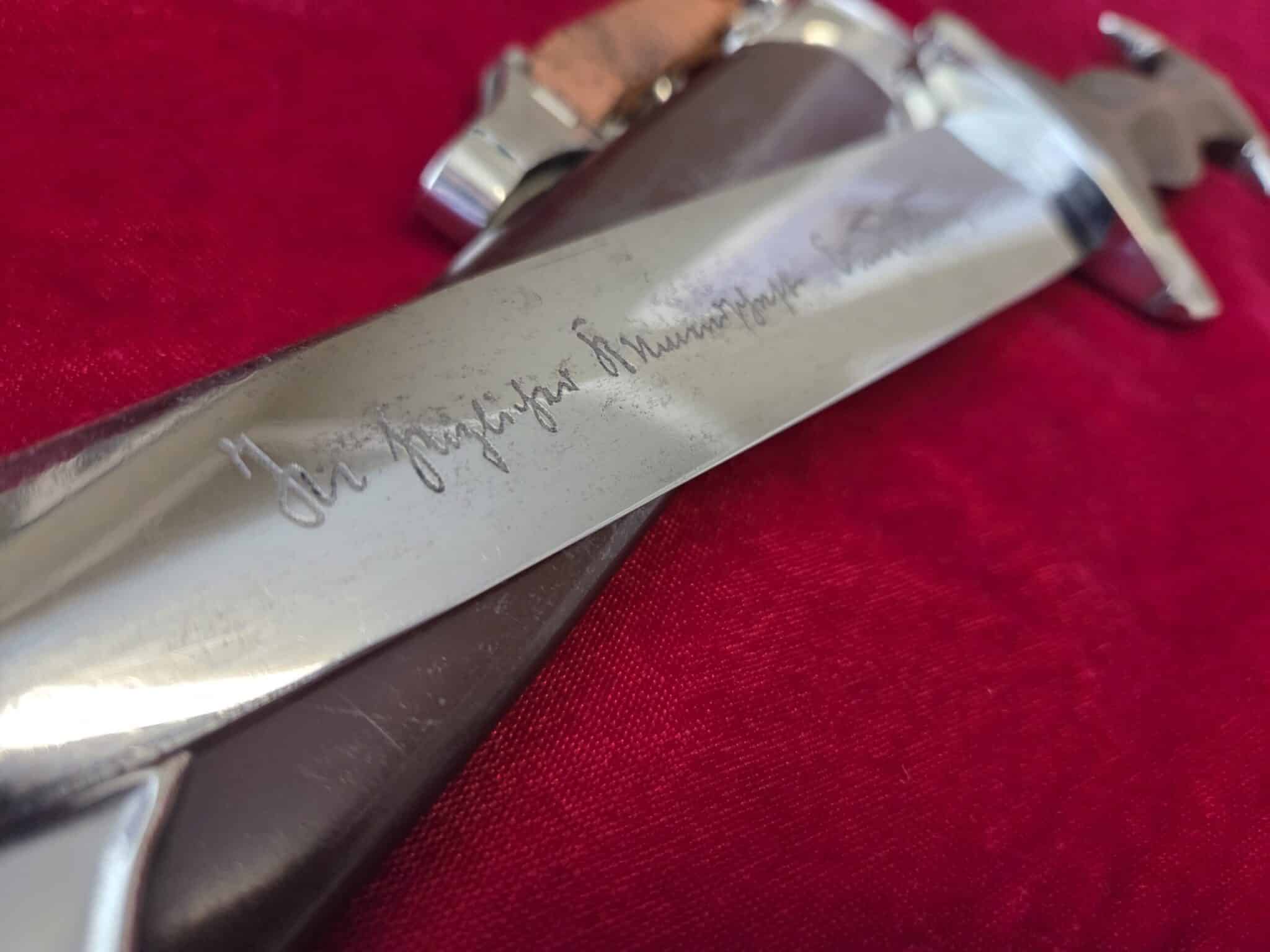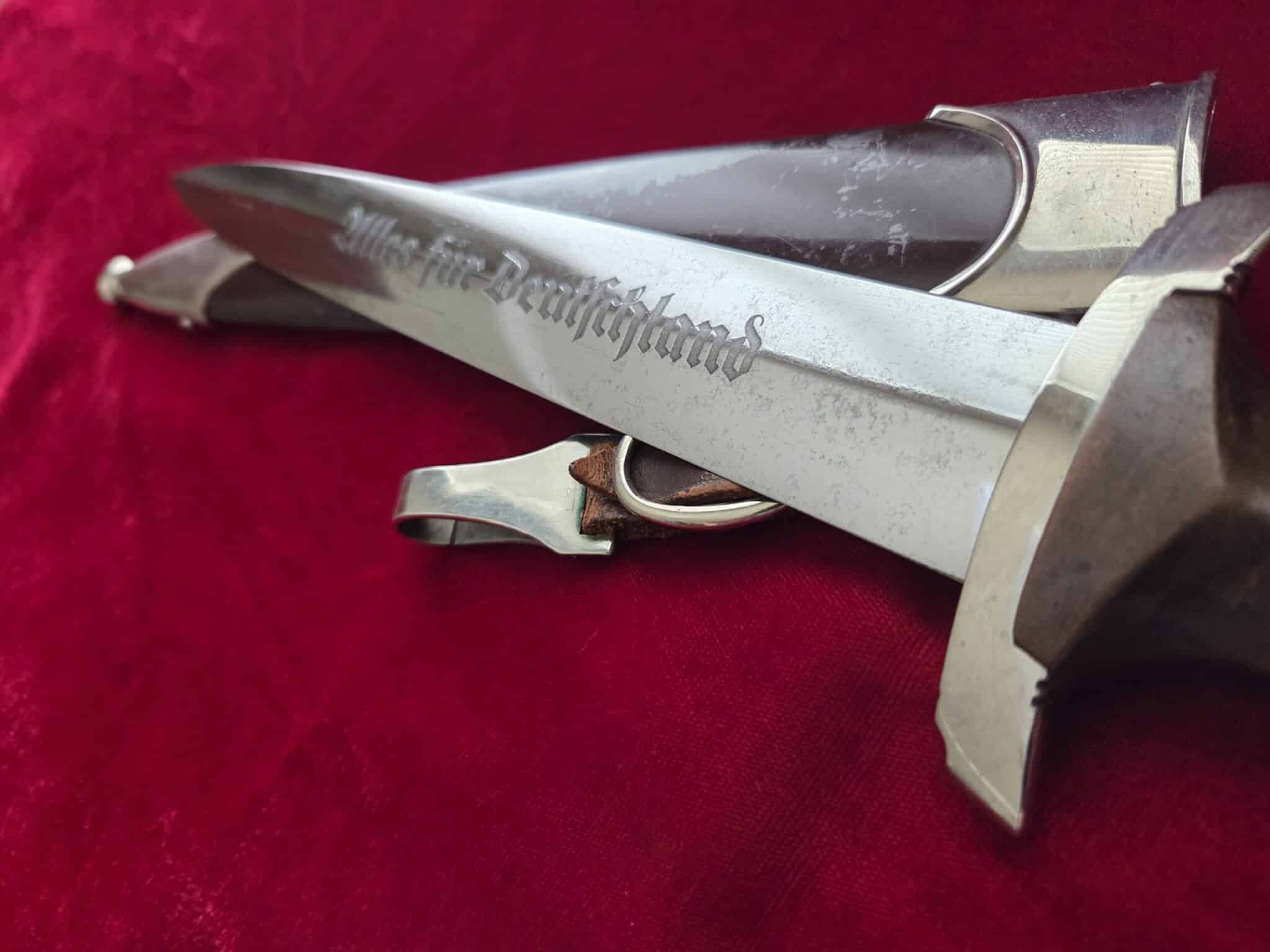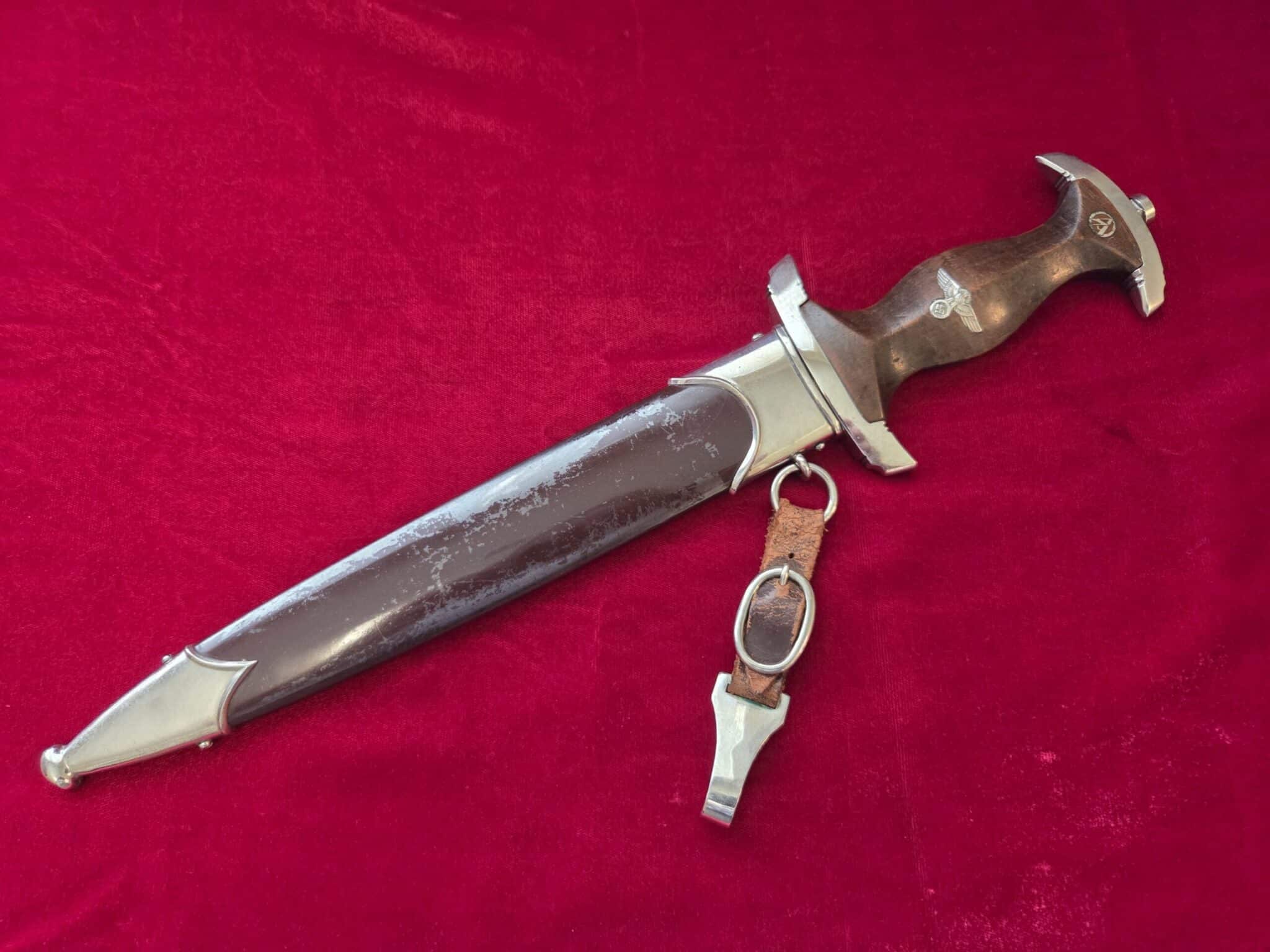 Carl Eickhorn – Solingen trademark. Nickel/silver crossguards with reverse side of lower crossguard marked with “B”. Light runner marks and speckling on blade but no nicks to cutting edge and tip remains intact. Scabbard is dent free with 50-55% of anodized finish with nickel fittings. Lower scabbard fitting shows some minor dings and one corner of ball looks to have been dropped and is slightly dented with a split in the corner of ball. Wooden grip is in EXC++/Near MINT condition and the nickel/silver eagle and SA inserts are properly set. Hanger leather is very worn but hanger clip works perfectly.