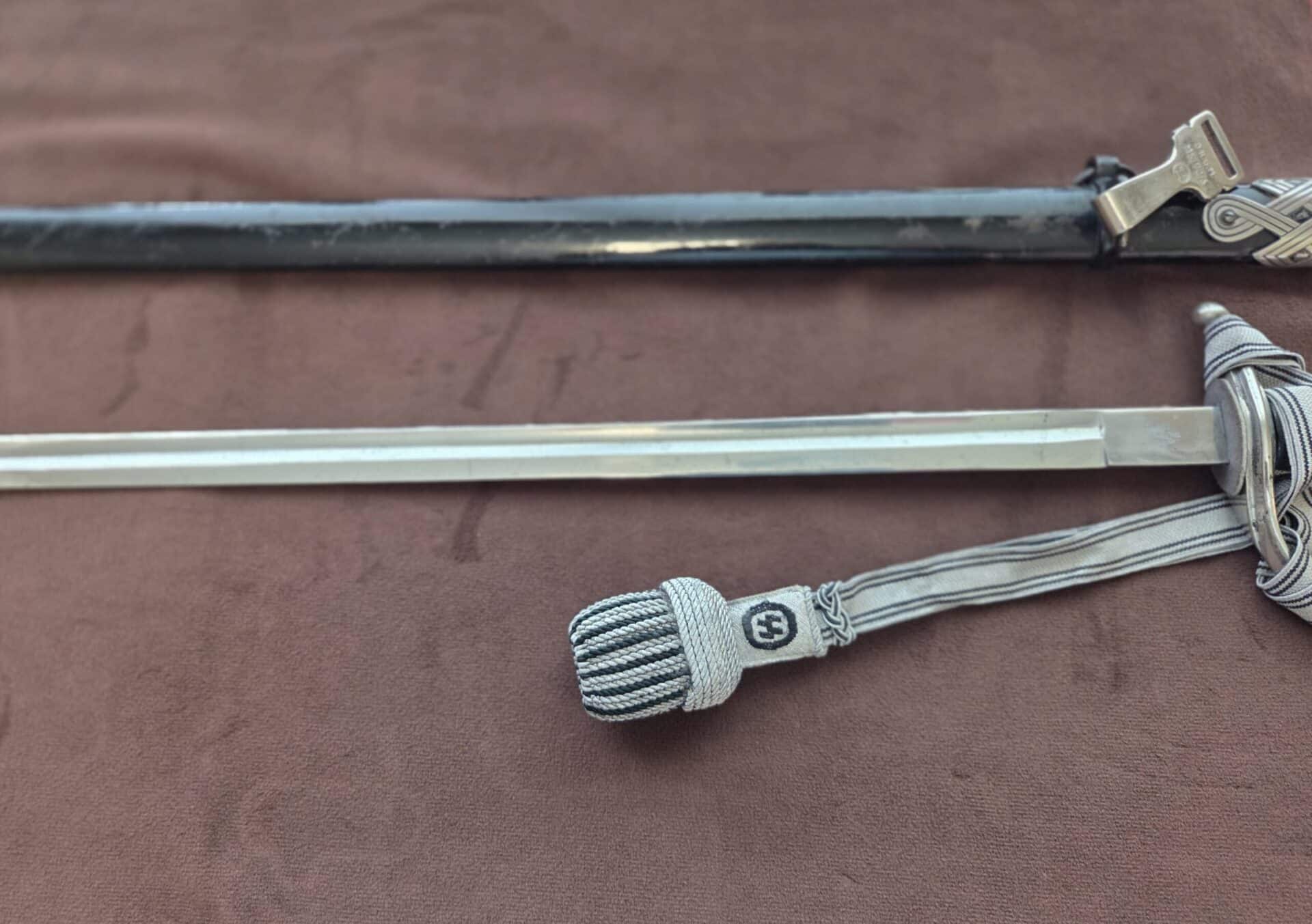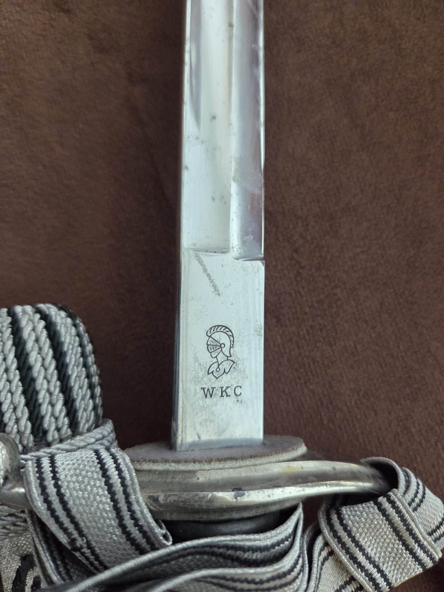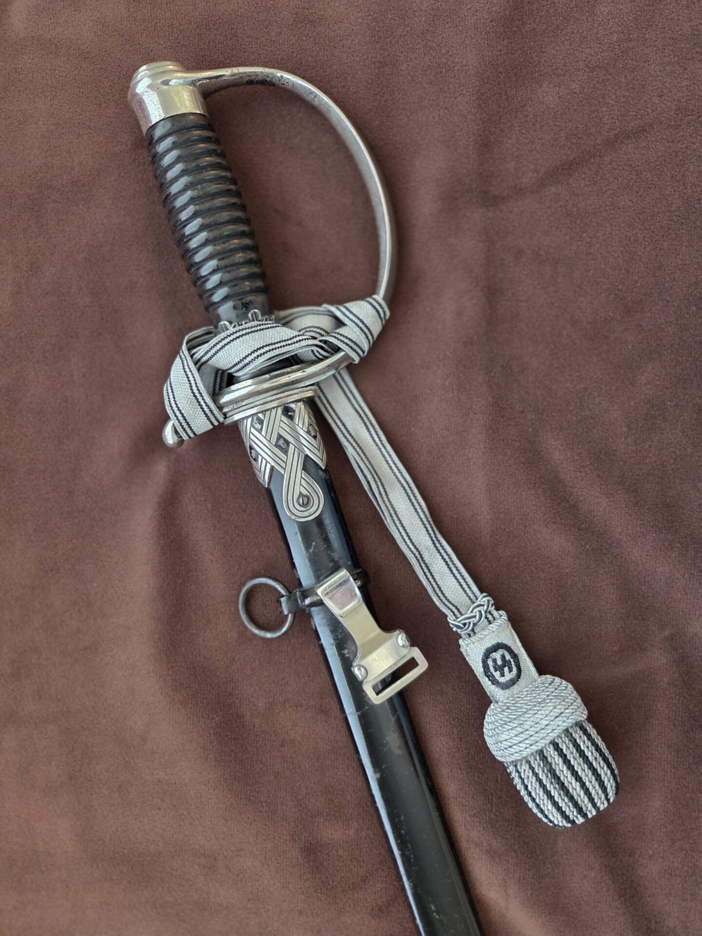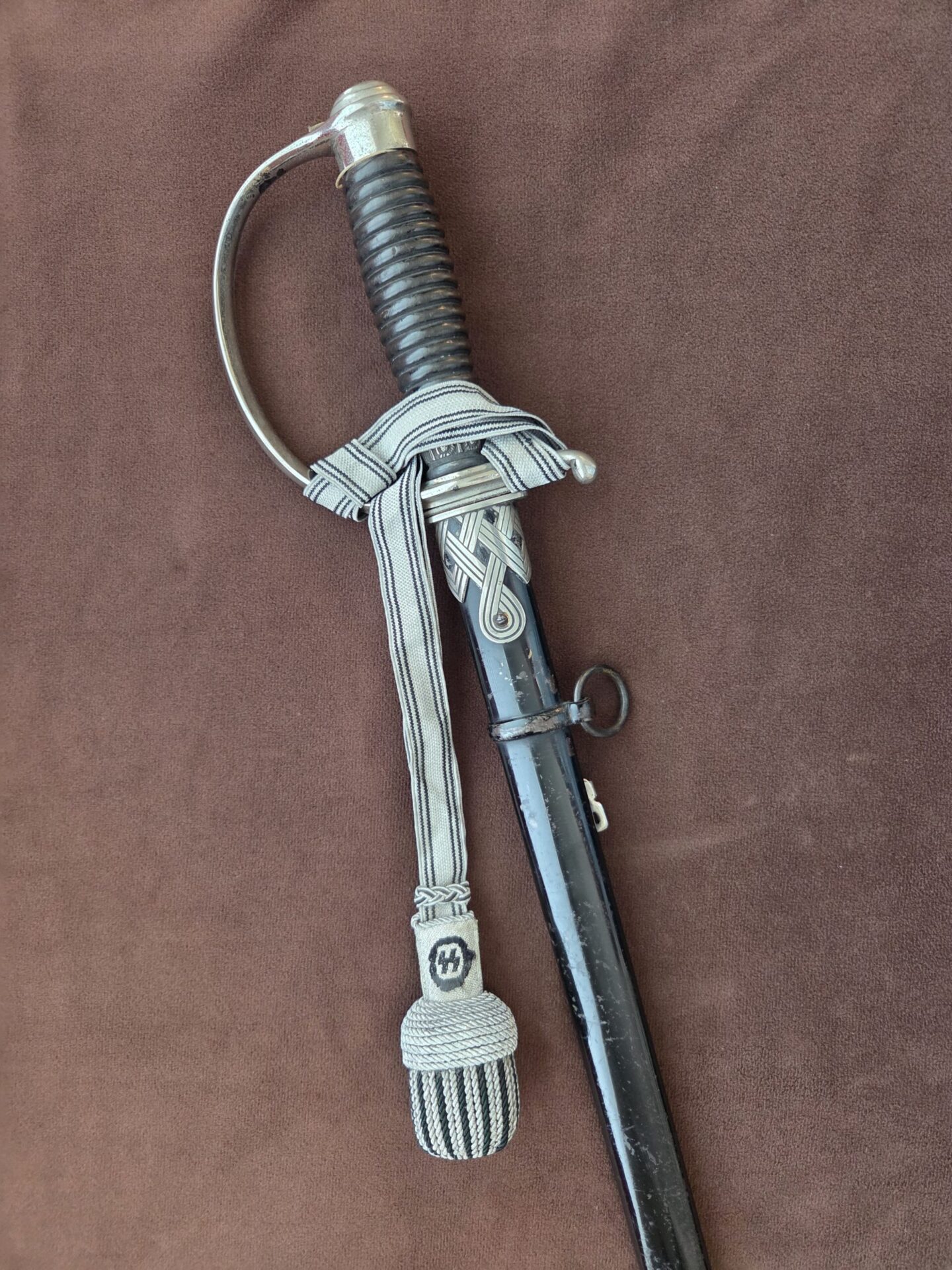 Stamped knight’s helmet above WKC TM. An illustration of this pattern police sword appears in the WKC- WAFFENFABRIK sales catalog as Nr. 1063 Polizei-Führer-Degen. Under provisions of the Decree of 17 June 1936 Reichsführer-SS, Heinrich Himmler assumed full power over the entire German police organization and as such many members of the police held dual membership in the Police and SS. This sword is an example of this dual membership policy. Nickel-plated hilt fittings show minor age/surface wear. The pommel top has the SS runes with nice darkening background around edges. The nickel-plated hilt fittings show normal wear with some plate flaking. Black wooden grip shows surface wear and some loss of color to finish. Polished, matte finish blade measuring 31 1/2” in length grades EX+ showing light surface wear/runner marks, minor gray shadowing/speckling and no nicks to cutting edge. Blade is complete with leather buffer pad. The reverse ricasso is stamped with inter-locking SS runes. Steel scabbard retains approximately 85% of the original black enamel showing minor surface wear/scratches with specks of missing paint on obverse/reverse. Nickel-plated upper scabbard fitting retains some of the factory darkening in the recesses of the raised guilloche design. The scabbard throat is without SS markings and both retaining screws are present and undamaged. The scabbard upper fitting has a clip stamped “DRGM M5/72/3 RZM”. Complete with SS portepee in EXC++/Near MINT condition.