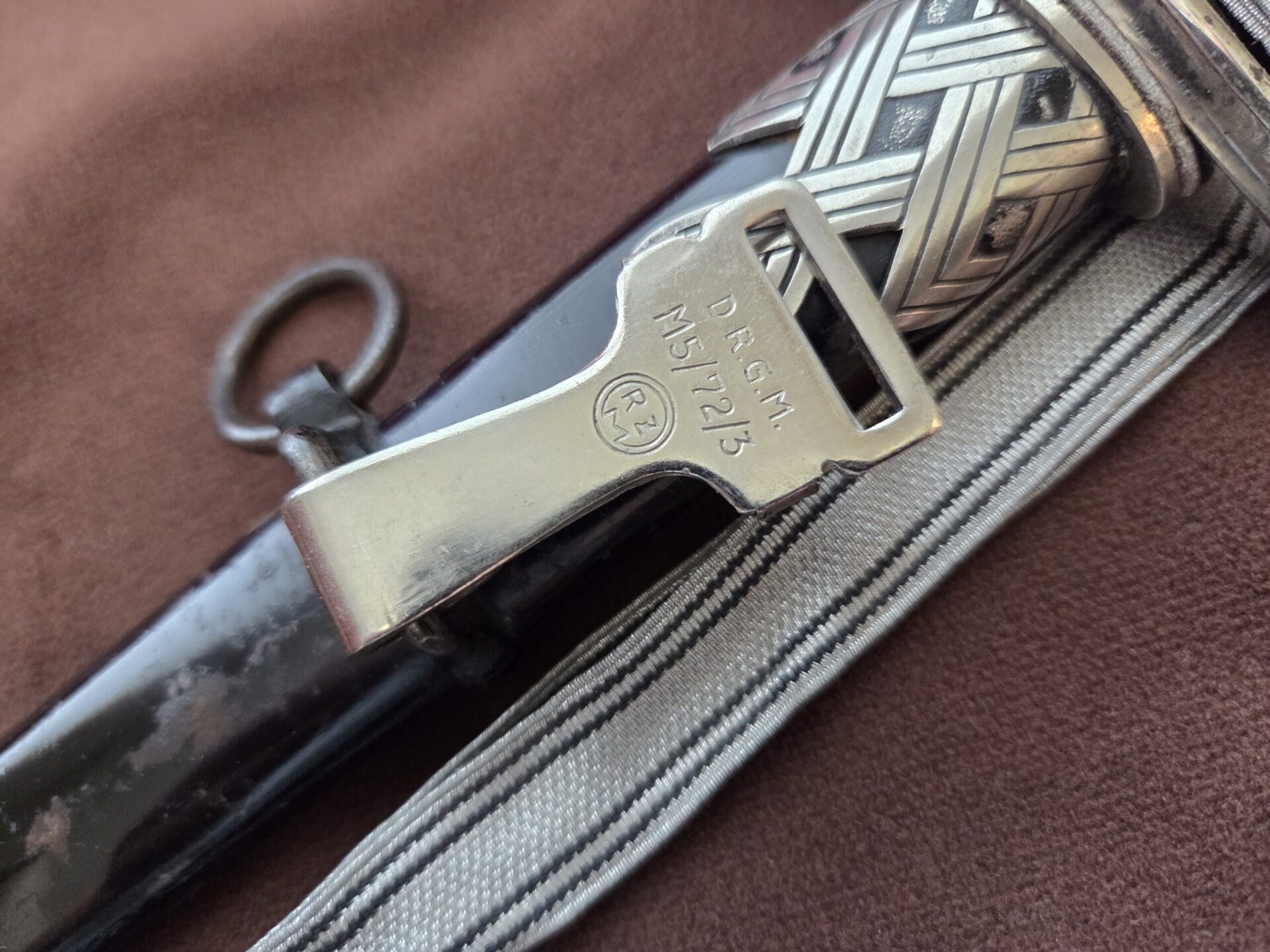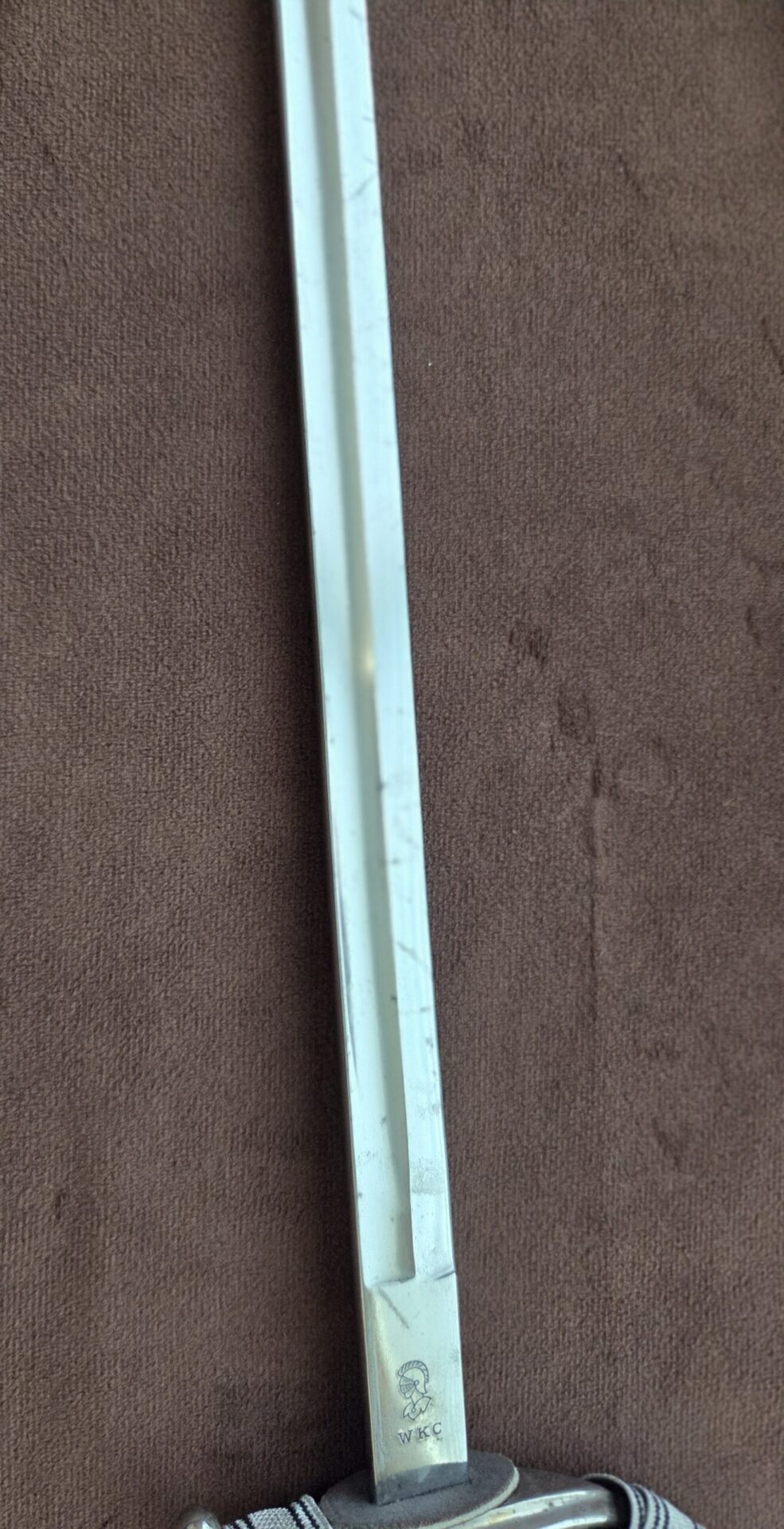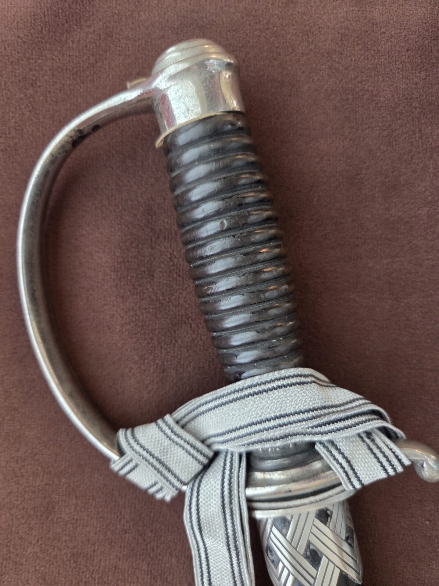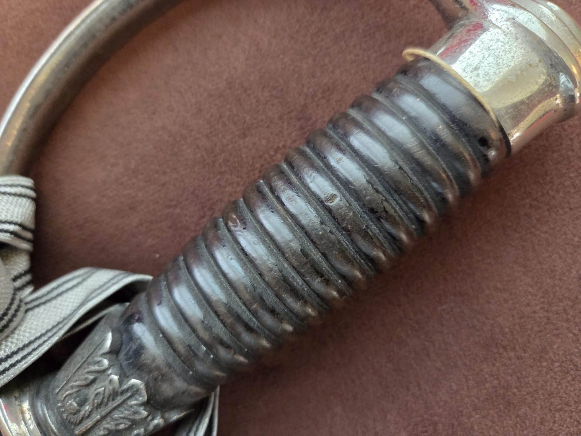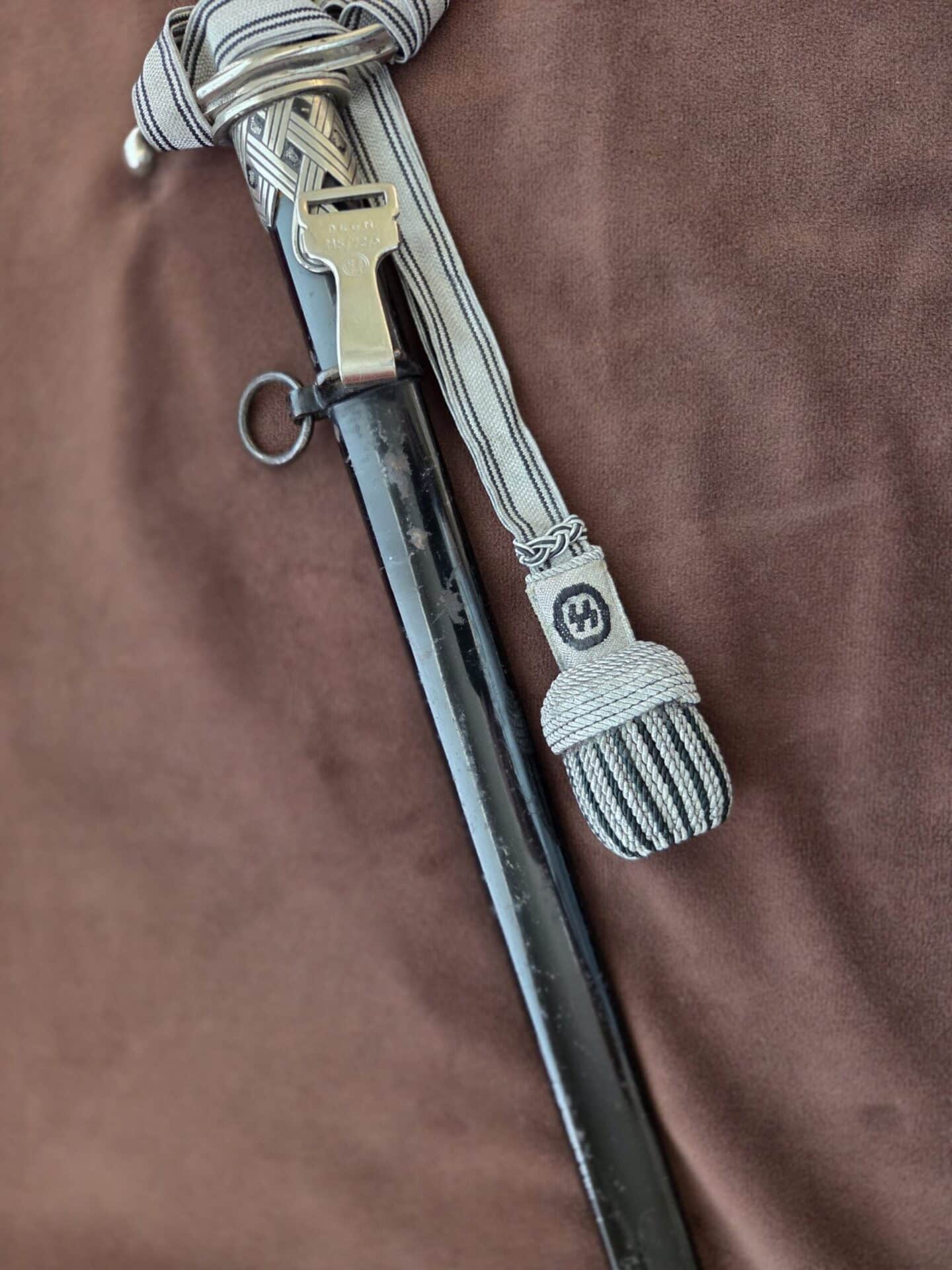 Stamped knight’s helmet above WKC TM. An illustration of this pattern police sword appears in the WKC- WAFFENFABRIK sales catalog as Nr. 1063 Polizei-Führer-Degen. Under provisions of the Decree of 17 June 1936 Reichsführer-SS, Heinrich Himmler assumed full power over the entire German police organization and as such many members of the police held dual membership in the Police and SS. This sword is an example of this dual membership policy. Nickel-plated hilt fittings show minor age/surface wear. The pommel top has the SS runes with nice darkening background around edges. The nickel-plated hilt fittings show normal wear with some plate flaking. Black wooden grip shows surface wear and some loss of color to finish. Polished, matte finish blade measuring 31 1/2” in length grades EX+ showing light surface wear/runner marks, minor gray shadowing/speckling and no nicks to cutting edge. Blade is complete with leather buffer pad. The reverse ricasso is stamped with inter-locking SS runes. Steel scabbard retains approximately 85% of the original black enamel showing minor surface wear/scratches with specks of missing paint on obverse/reverse. Nickel-plated upper scabbard fitting retains some of the factory darkening in the recesses of the raised guilloche design. The scabbard throat is without SS markings and both retaining screws are present and undamaged. The scabbard upper fitting has a clip stamped “DRGM M5/72/3 RZM”. Complete with SS portepee in EXC++/Near MINT condition.