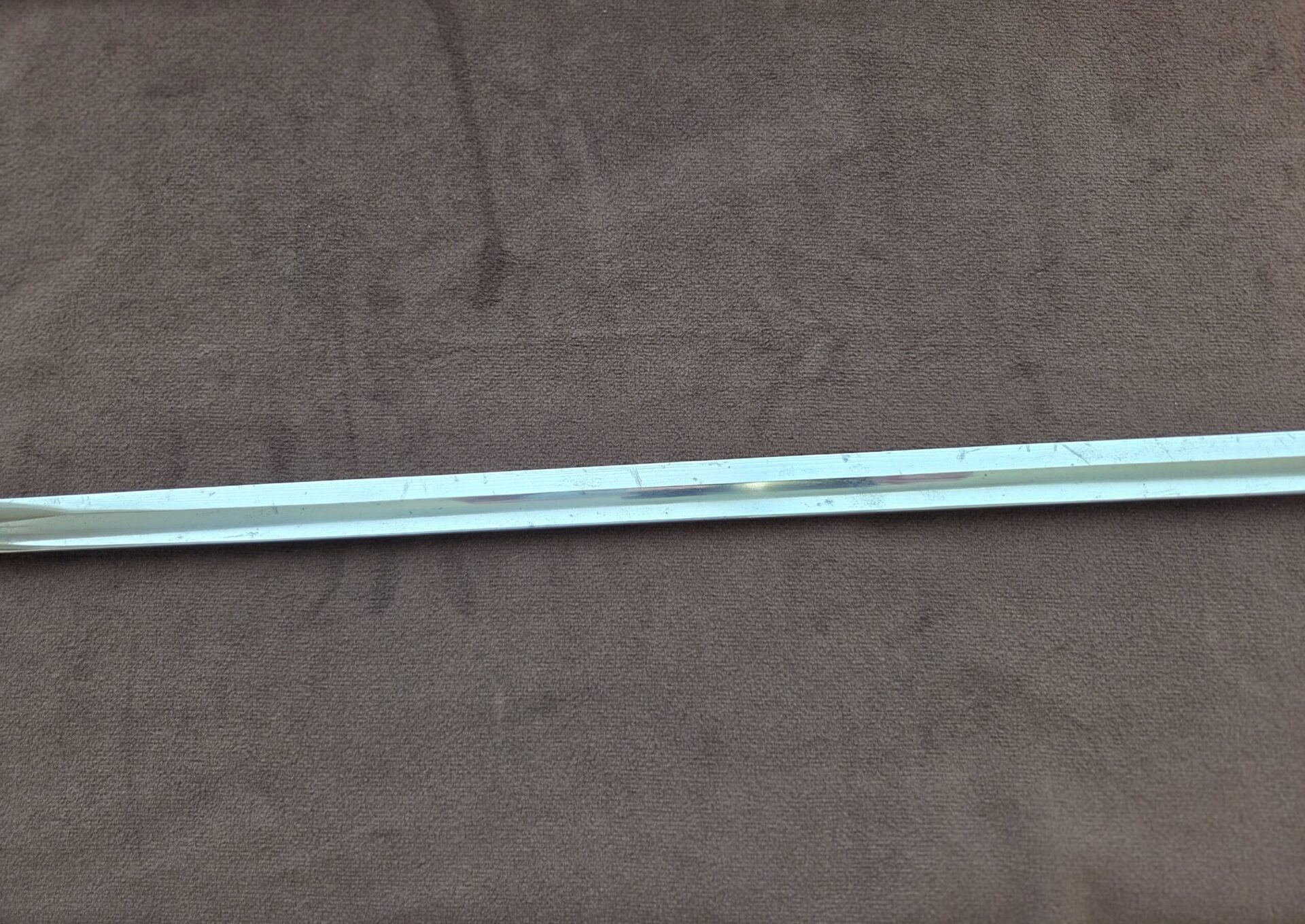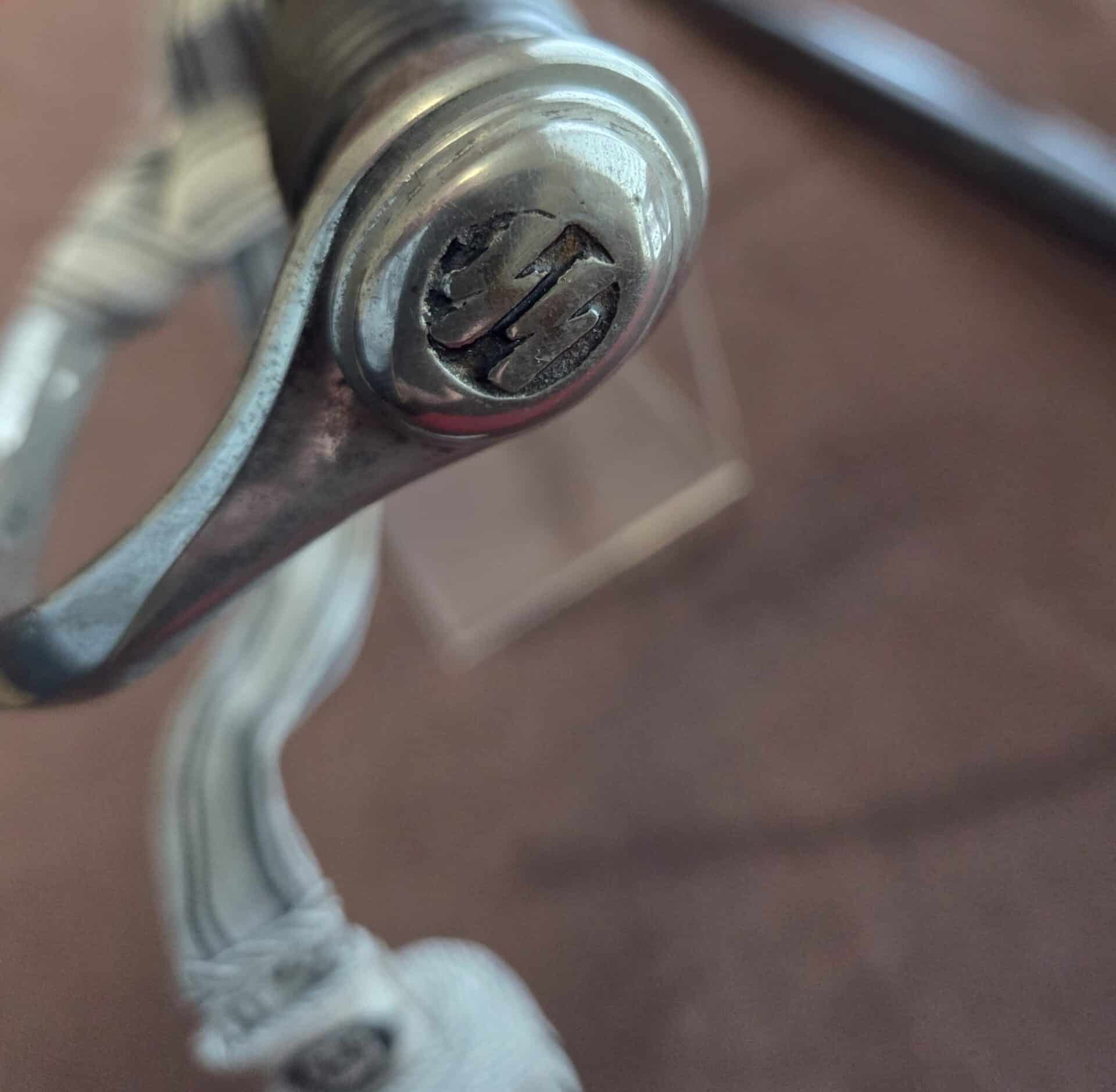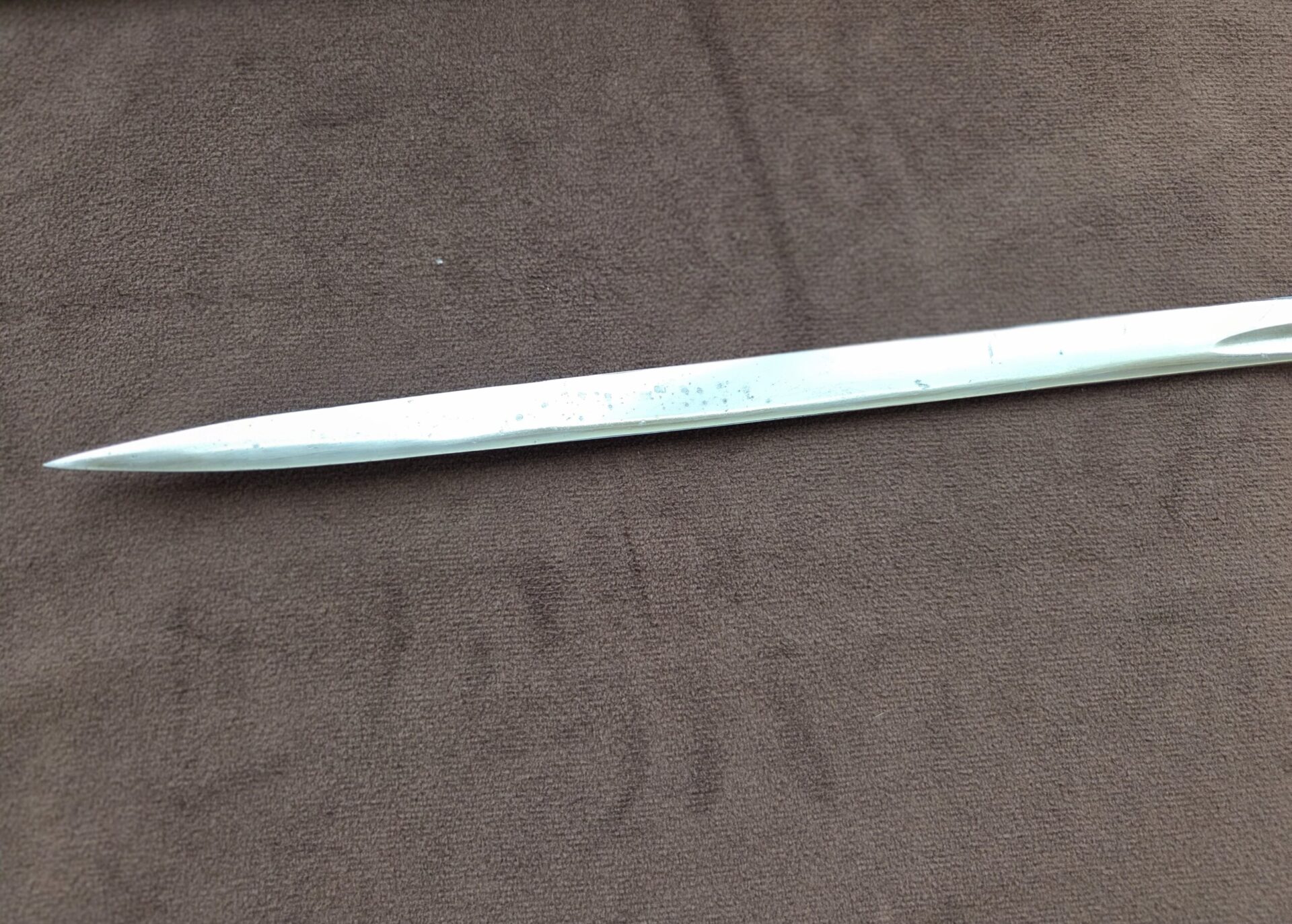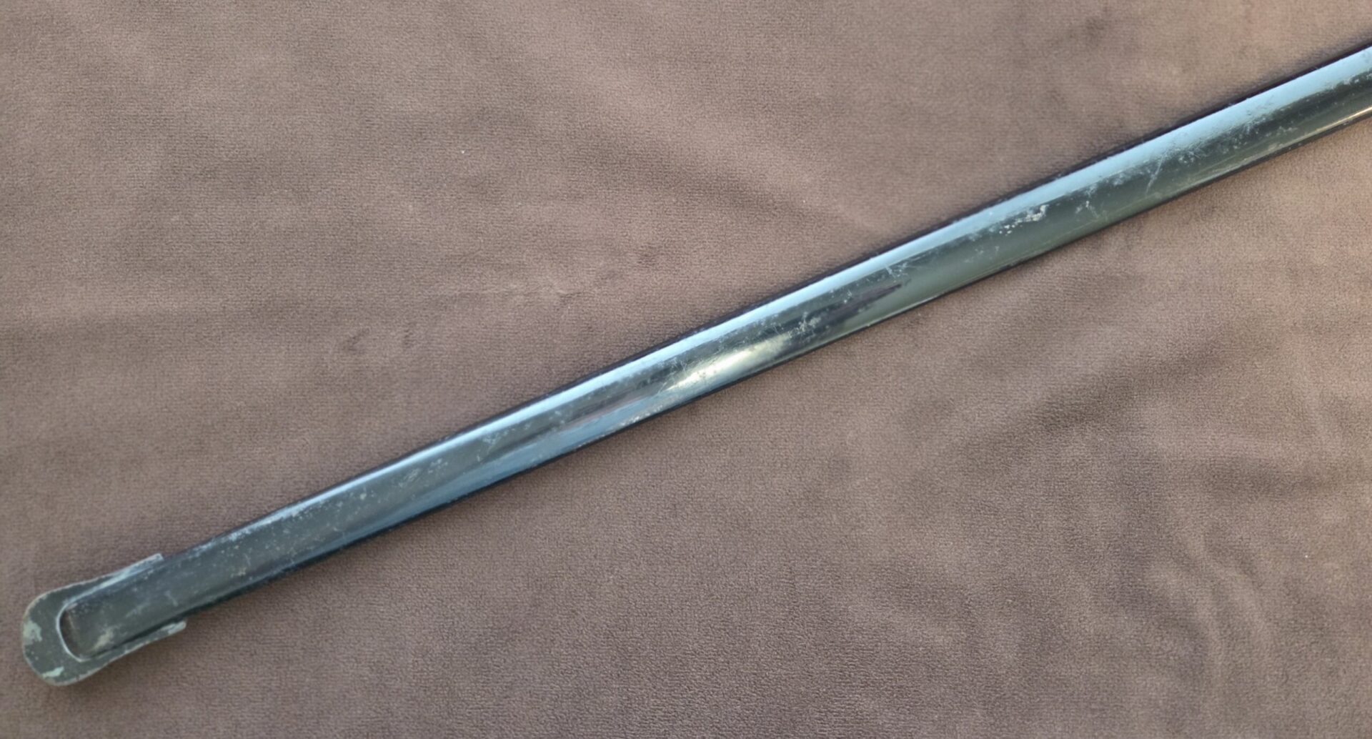 Stamped knight’s helmet above WKC TM. An illustration of this pattern police sword appears in the WKC- WAFFENFABRIK sales catalog as Nr. 1063 Polizei-Führer-Degen. Under provisions of the Decree of 17 June 1936 Reichsführer-SS, Heinrich Himmler assumed full power over the entire German police organization and as such many members of the police held dual membership in the Police and SS. This sword is an example of this dual membership policy. Nickel-plated hilt fittings show minor age/surface wear. The pommel top has the SS runes with nice darkening background around edges. The nickel-plated hilt fittings show normal wear with some plate flaking. Black wooden grip shows surface wear and some loss of color to finish. Polished, matte finish blade measuring 31 1/2” in length grades EX+ showing light surface wear/runner marks, minor gray shadowing/speckling and no nicks to cutting edge. Blade is complete with leather buffer pad. The reverse ricasso is stamped with inter-locking SS runes. Steel scabbard retains approximately 85% of the original black enamel showing minor surface wear/scratches with specks of missing paint on obverse/reverse. Nickel-plated upper scabbard fitting retains some of the factory darkening in the recesses of the raised guilloche design. The scabbard throat is without SS markings and both retaining screws are present and undamaged. The scabbard upper fitting has a clip stamped “DRGM M5/72/3 RZM”. Complete with SS portepee in EXC++/Near MINT condition.