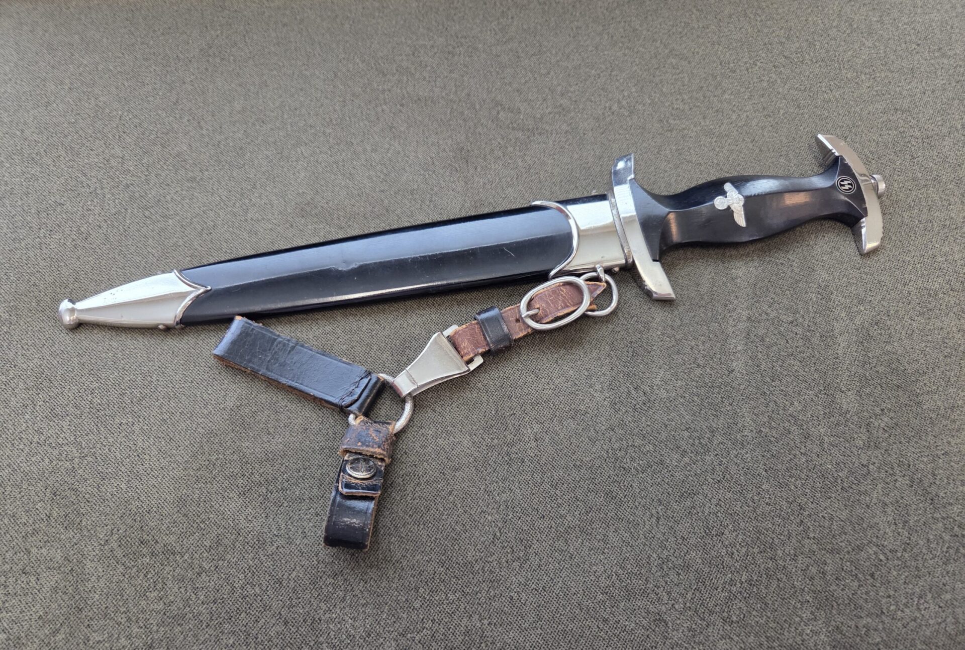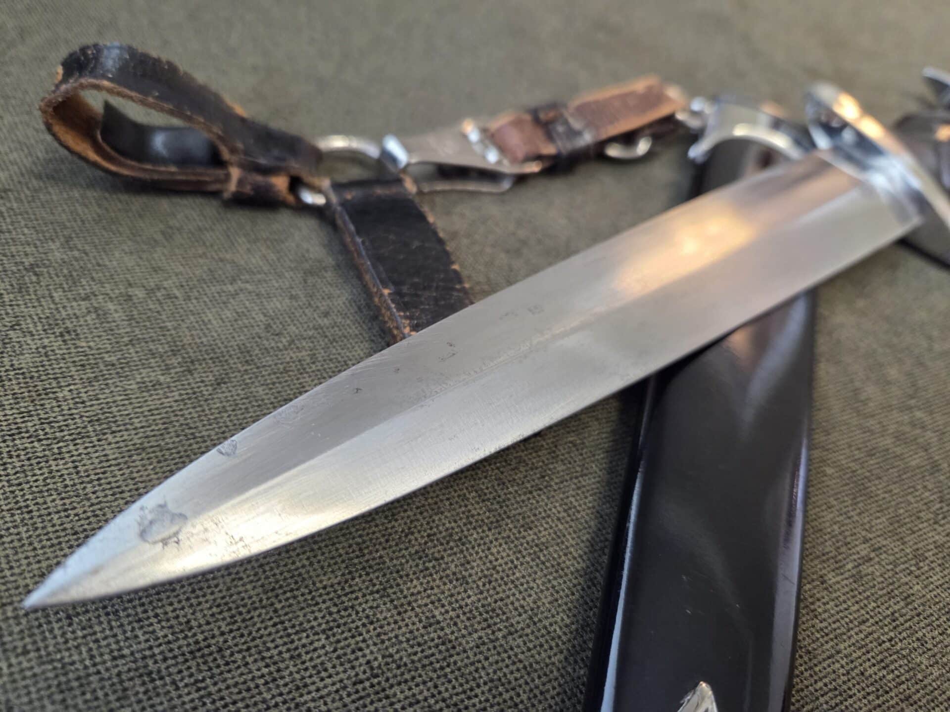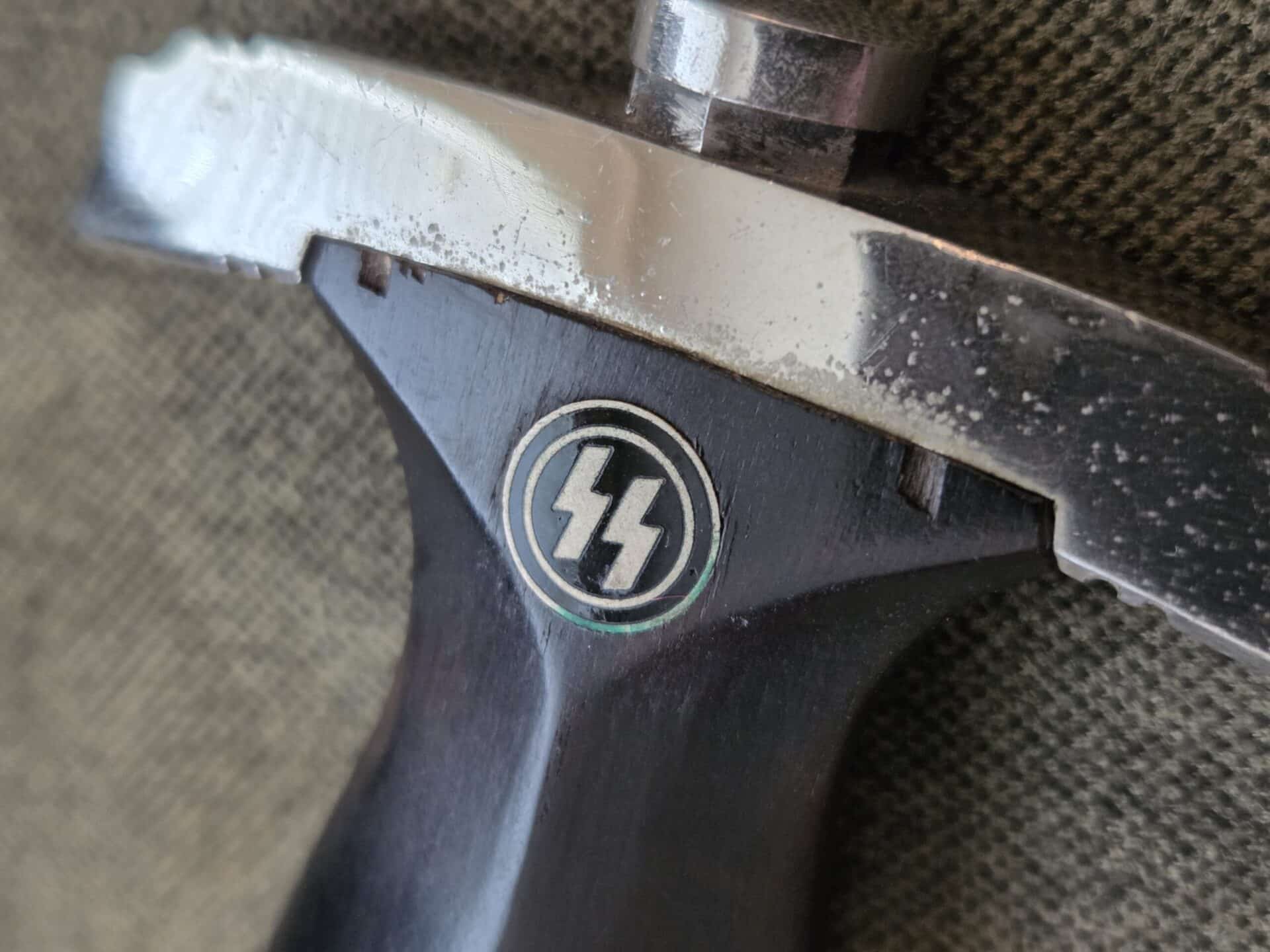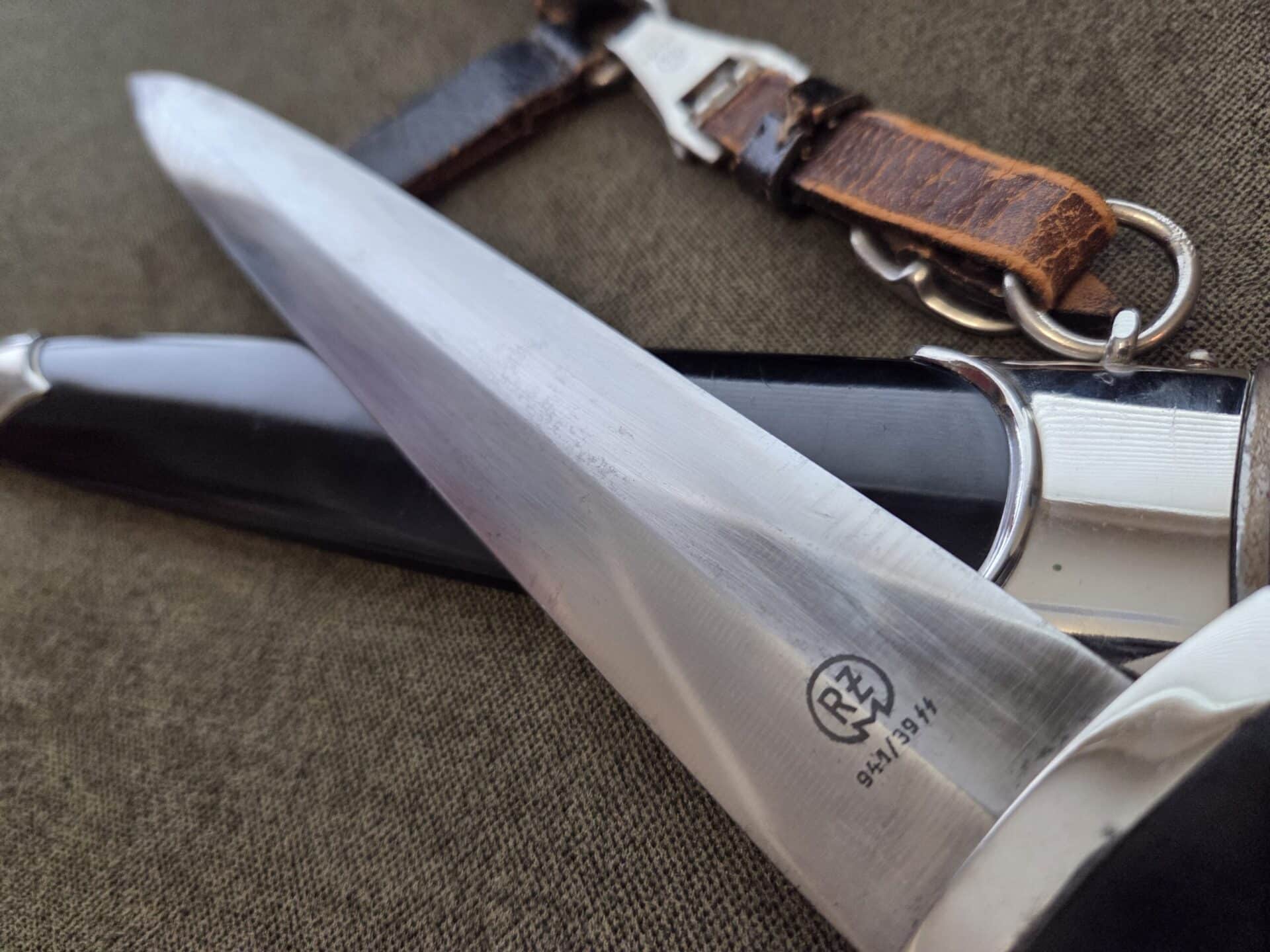 RZM 941/39 SS (Unknown maker) on reverse blade ricasso. Hilt fittings show minor surface wear/age. Grip shows light wear with one chip on reverse upper corner near crossguard and two tiny chips on the obverse upper corners near crossguard. The eagle and SS inserts are properly inset. Polished blade grades EX+/EXC++ with deeply etched SS motto inscription which retains 100% of the light gray background frosting. Steel scabbard has one very minor dent on the obverse side, a couple of light scratches and retains 99% of its paint. Scabbard fittings show very light surface wear with no damage to lower ball. All four screws remain intact. Brown leather belt loop has wear and clip is marked RZM M5/71 olc on reverse side. Upper belt loops are black with a pebbled D-ring.