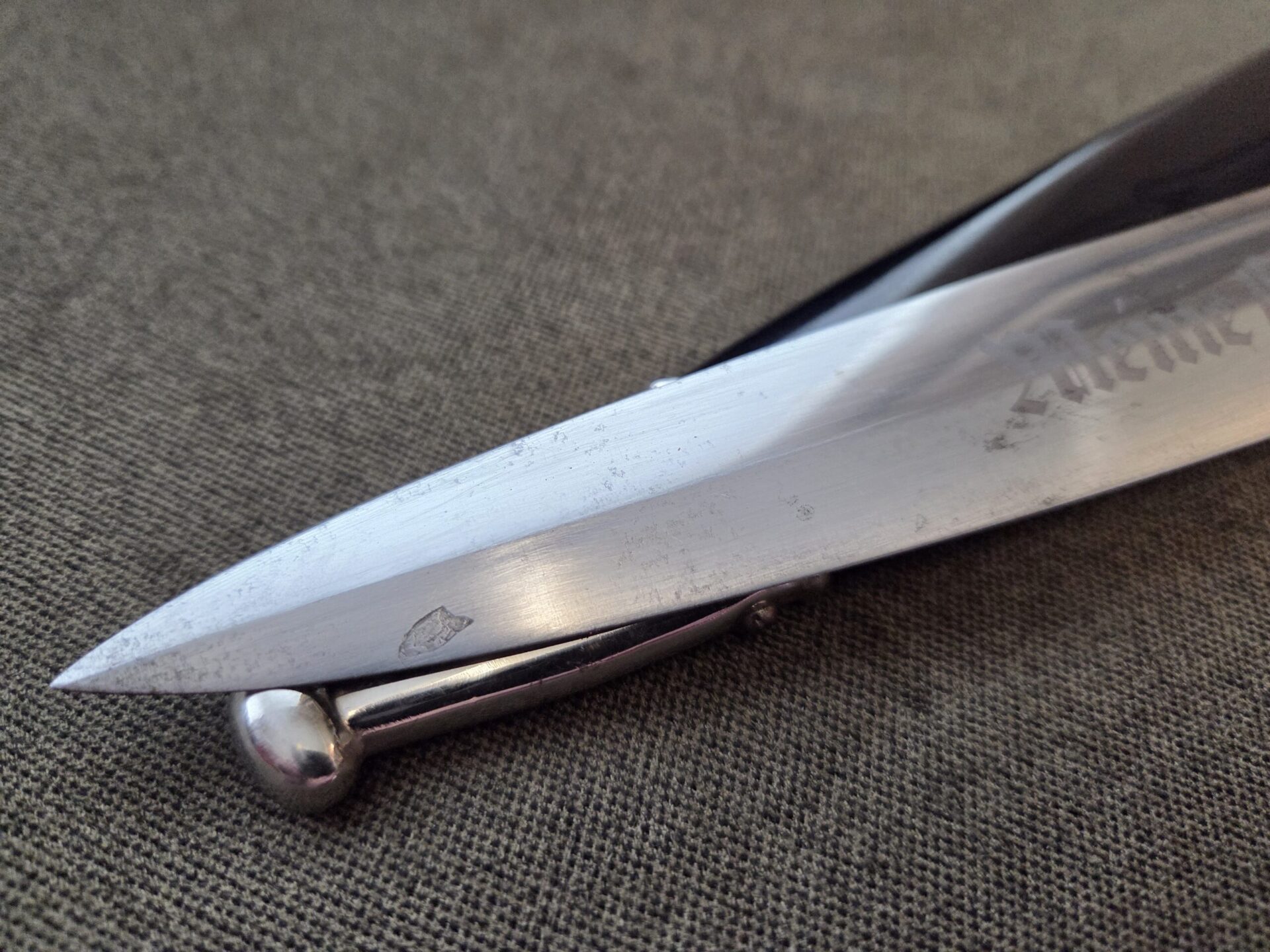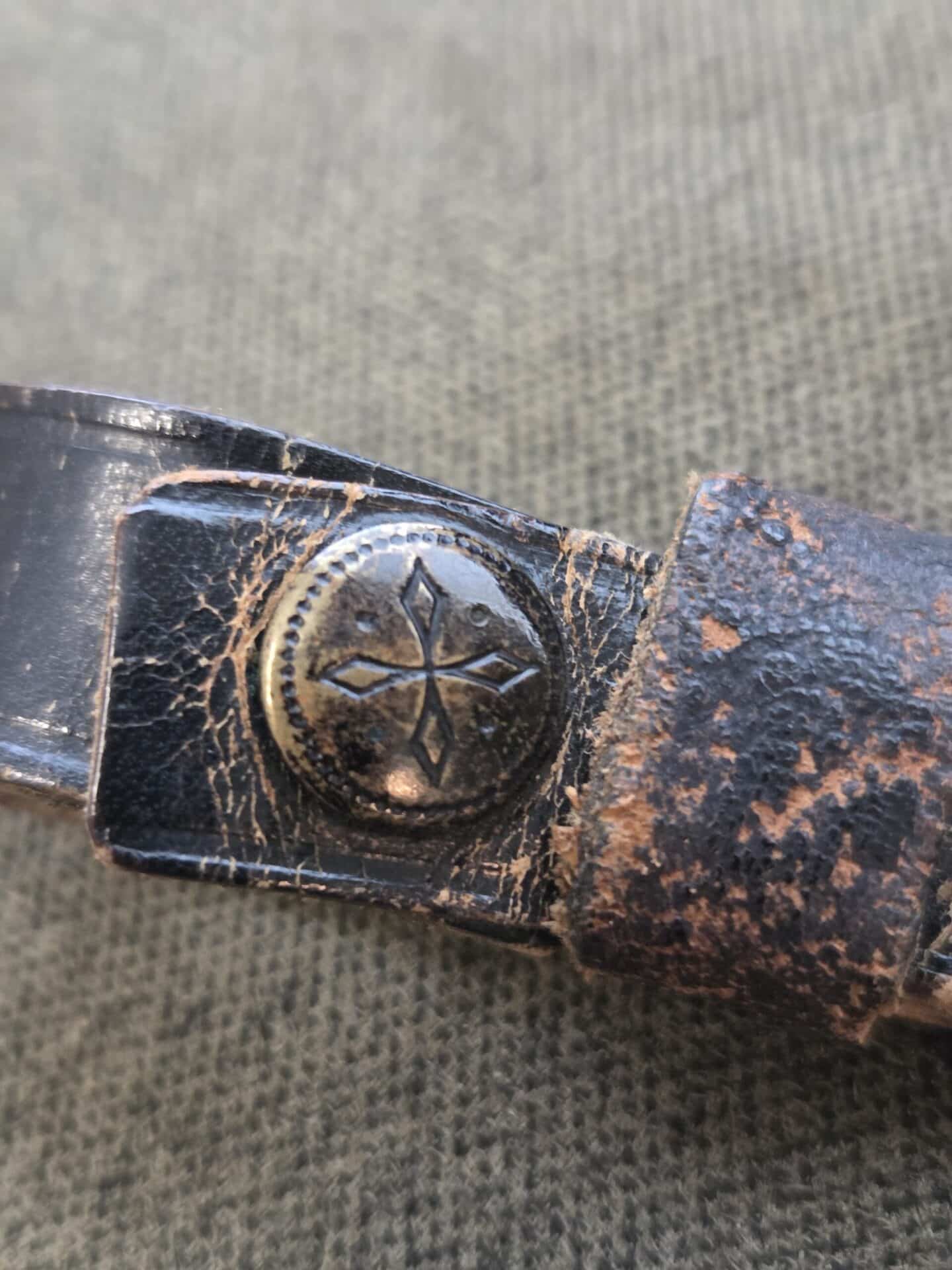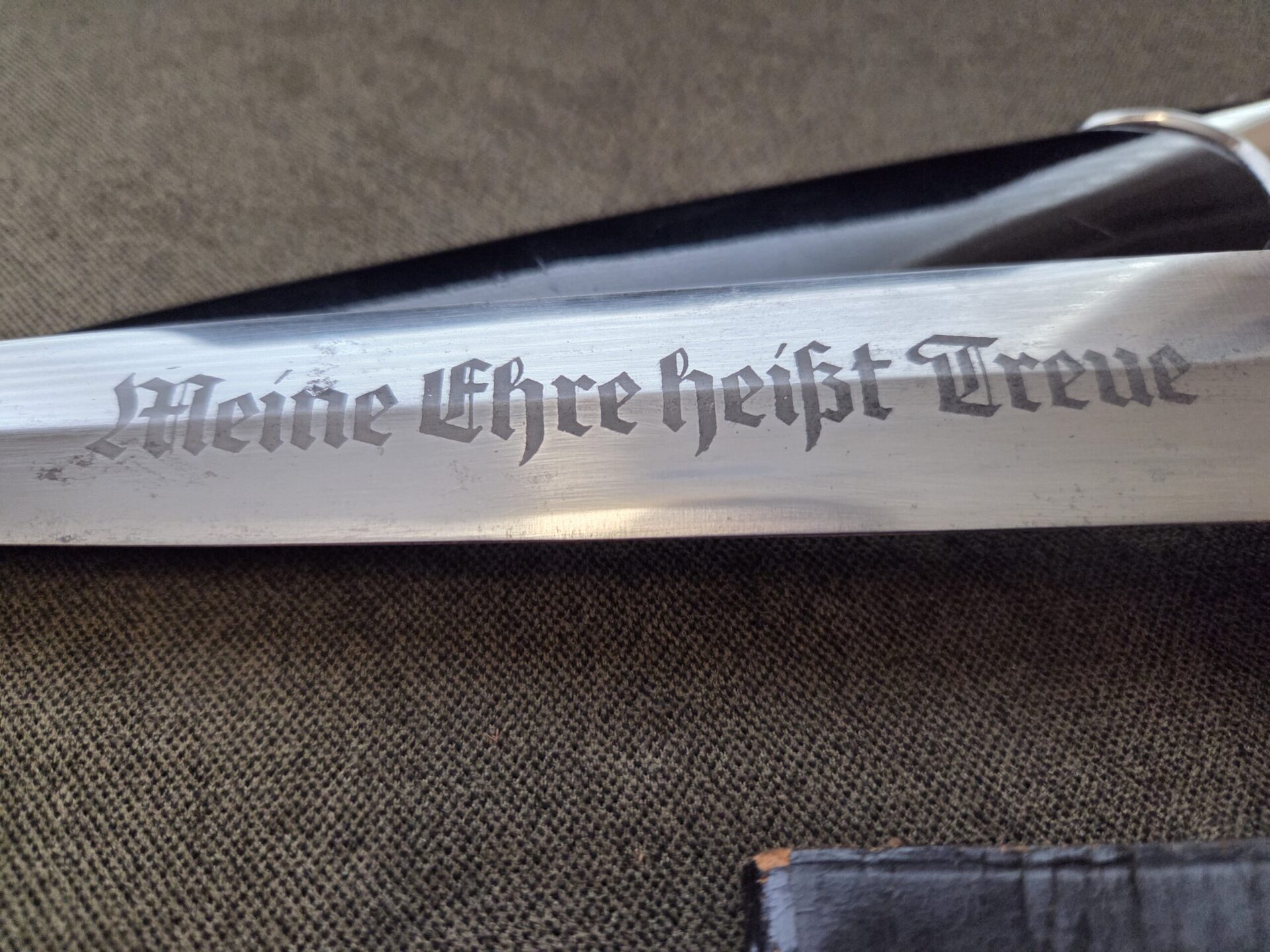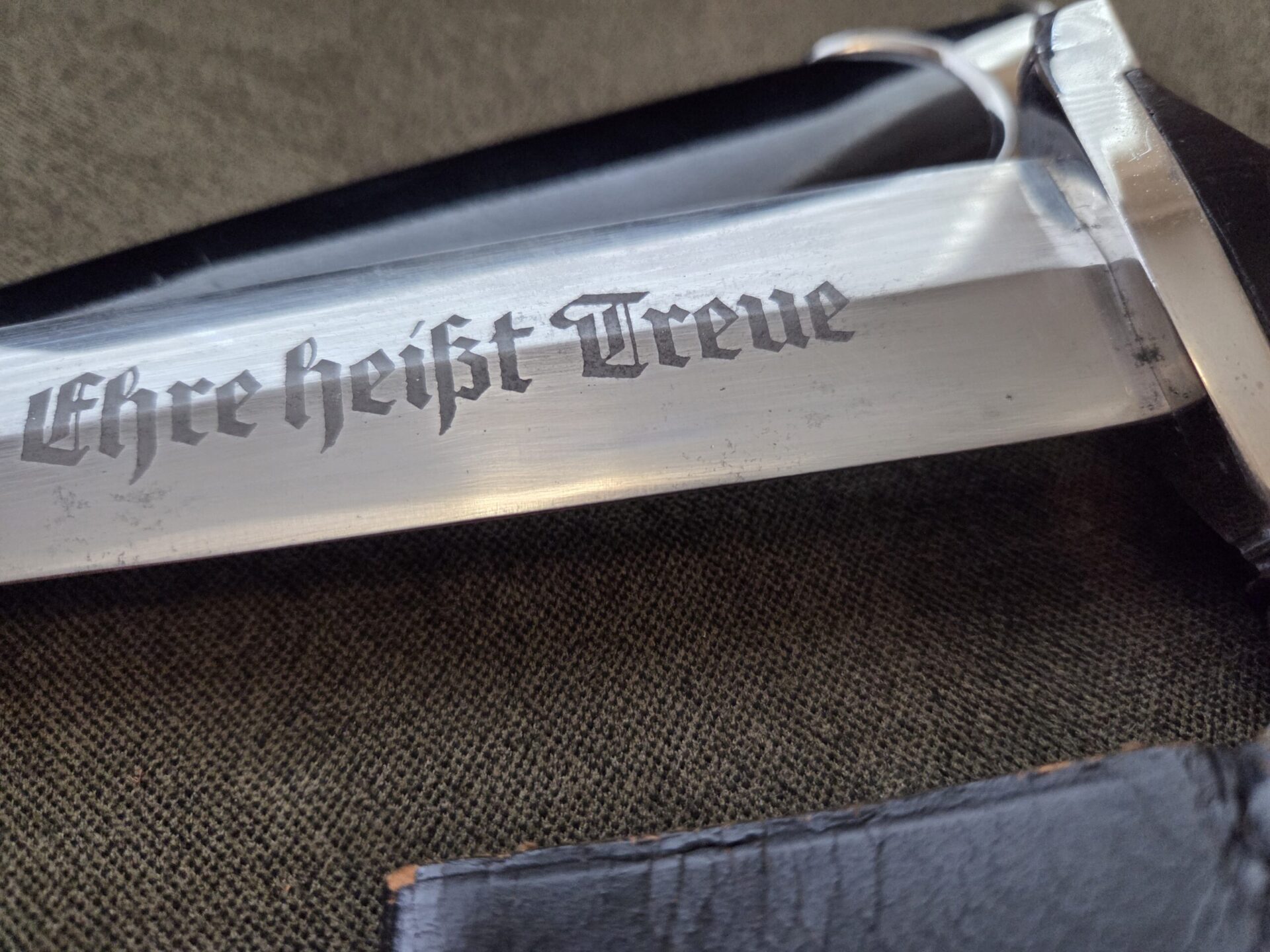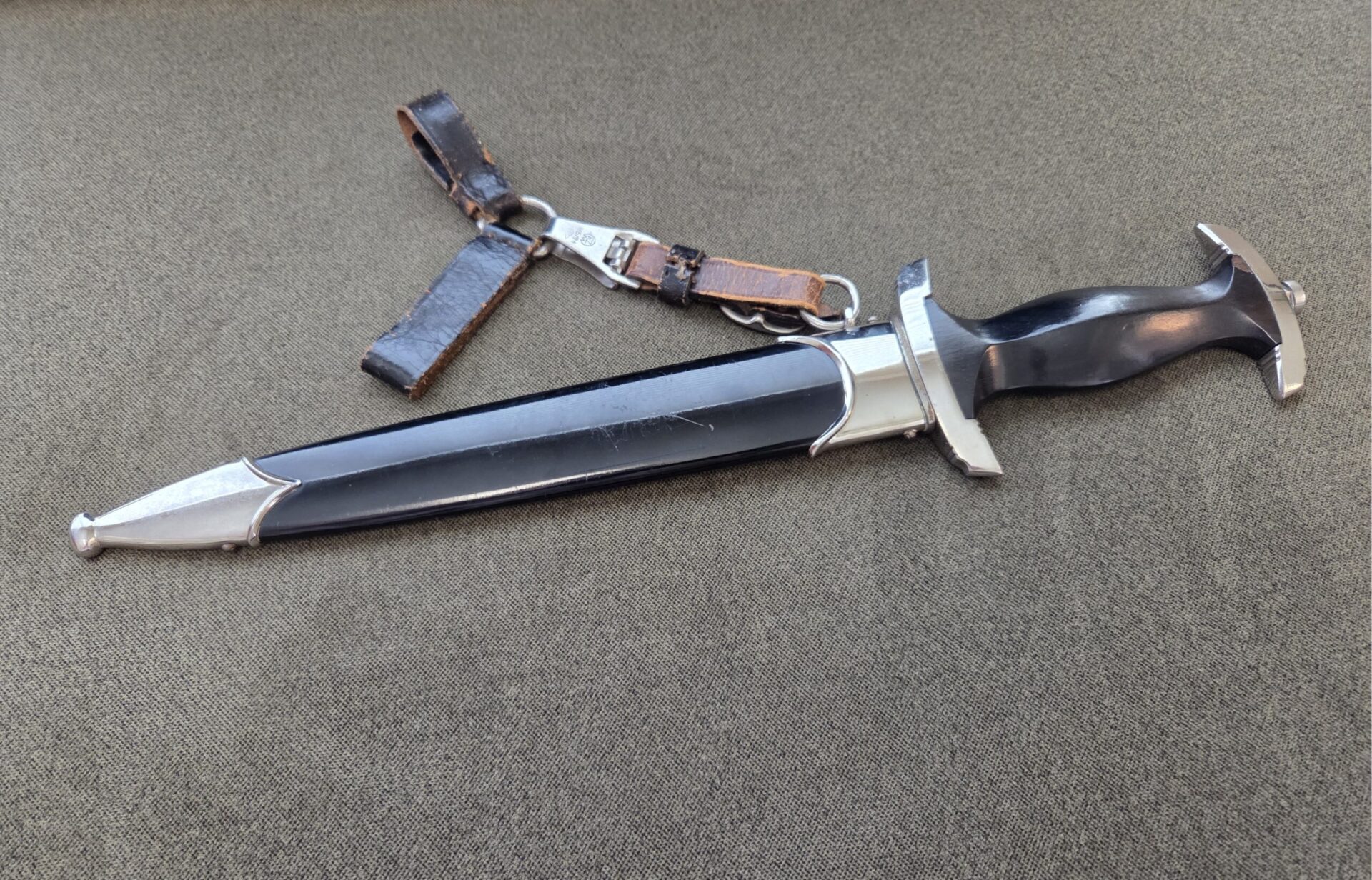 RZM 941/39 SS (Unknown maker) on reverse blade ricasso. Hilt fittings show minor surface wear/age. Grip shows light wear with one chip on reverse upper corner near crossguard and two tiny chips on the obverse upper corners near crossguard. The eagle and SS inserts are properly inset. Polished blade grades EX+/EXC++ with deeply etched SS motto inscription which retains 100% of the light gray background frosting. Steel scabbard has one very minor dent on the obverse side, a couple of light scratches and retains 99% of its paint. Scabbard fittings show very light surface wear with no damage to lower ball. All four screws remain intact. Brown leather belt loop has wear and clip is marked RZM M5/71 olc on reverse side. Upper belt loops are black with a pebbled D-ring.