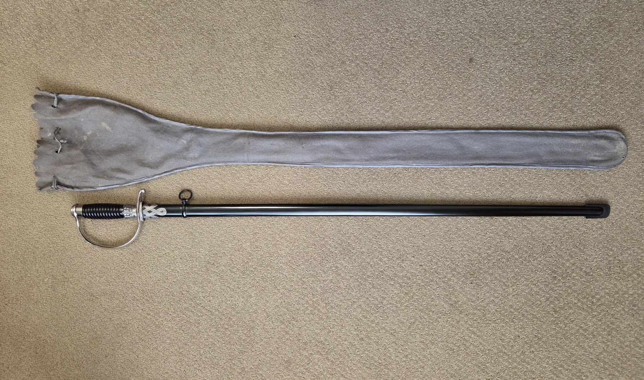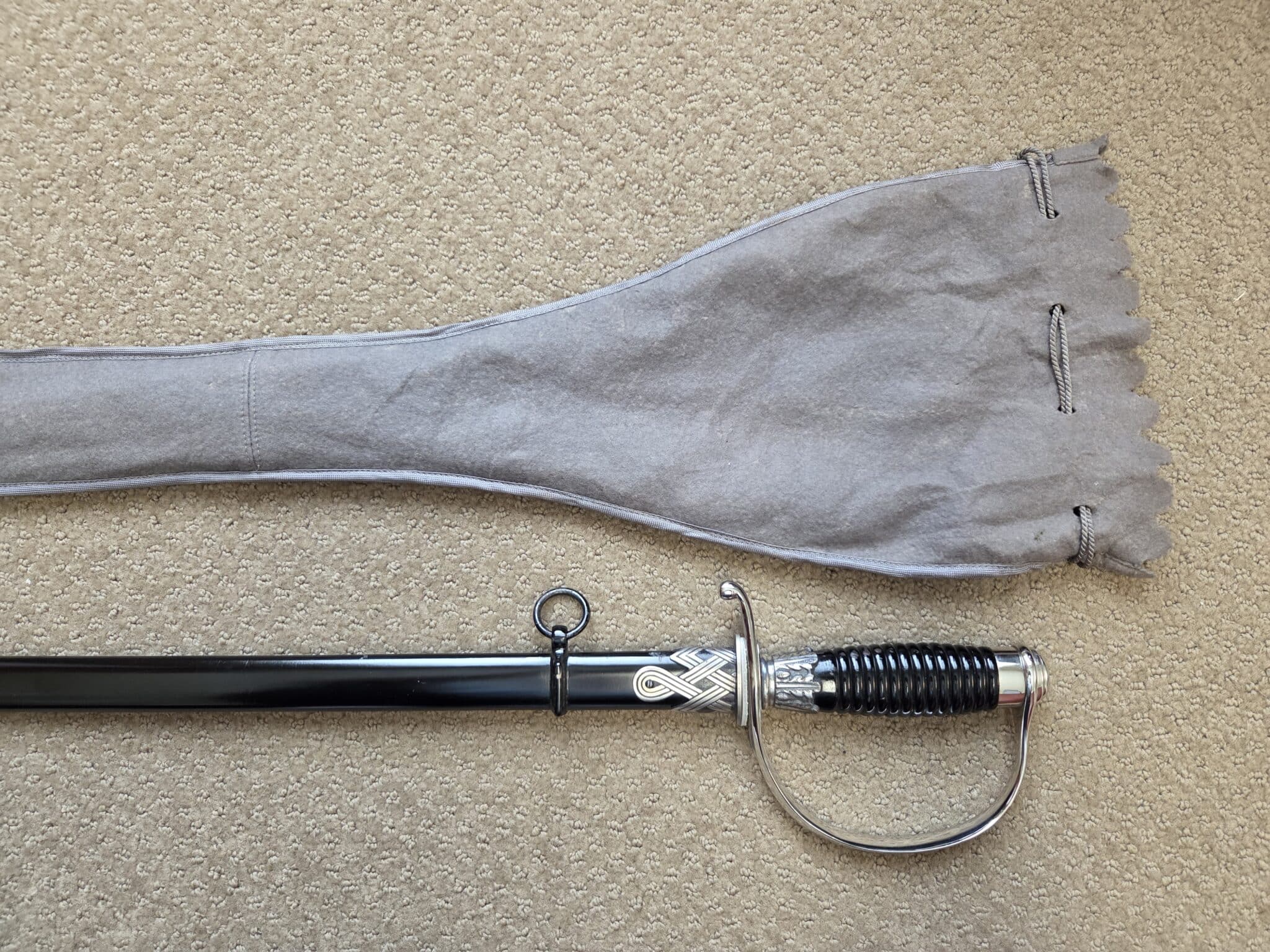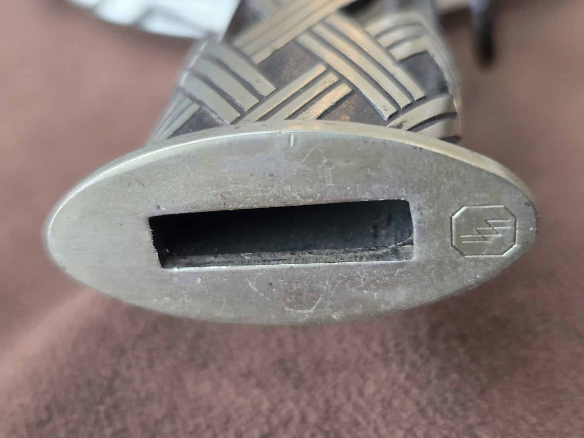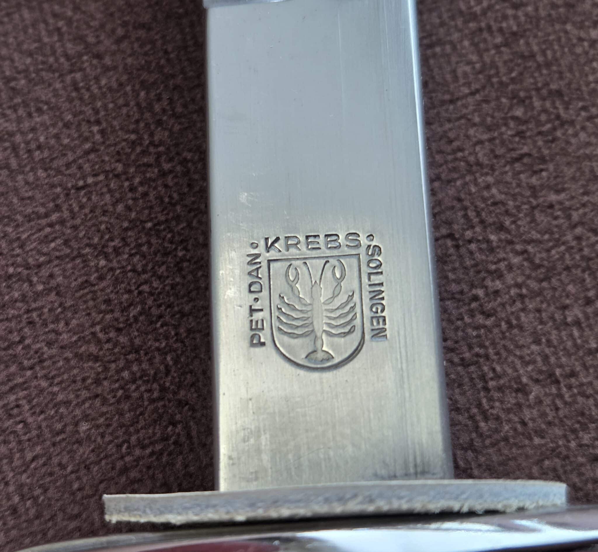 Pet. Dan. Krebs Solingen around the sides of a shield w/a stamped crayfish inside shield TM. Nickel-plated hilt fittings show no wear with no lifting or pitting to pommel, ferrule or knuckle-bow. Pommel cap, with raised cast SS Runes, retains 100% of the factory darkened background. Underside of crossguard is not SS proofmarked. Black wooden grip shows minor surface wear to black factory finish on highlights of several grip swirls, but no cracks or chips. Polished, straight, matte finished blade measuring 33” in length grades MINT showing no wear, graying, pitting or nicks to cutting edge and is complete with white leather blade buffer pad. Dent-free steel scabbard retains approximately 99% of the original black enamel with only a few tiny surface scratches, but no crazing or lifting to paint. Nickel-plated upper scabbard fitting shows minor age with virtually 100% of the black enamel in the recesses of the scrollwork design. Scabbard throat is SS proofmarked. Sword is complete with original mouse gray felt storage bag with minor mothing, but no rips, tears or repairs, and is complete with original tie string. NOTE: JRB&M has not and will not dissemble the sword to inspect for internal markings. Superb original combination and one of the finest SS NCO Swords JRB&M has ever offered. Near MINT/MINT
