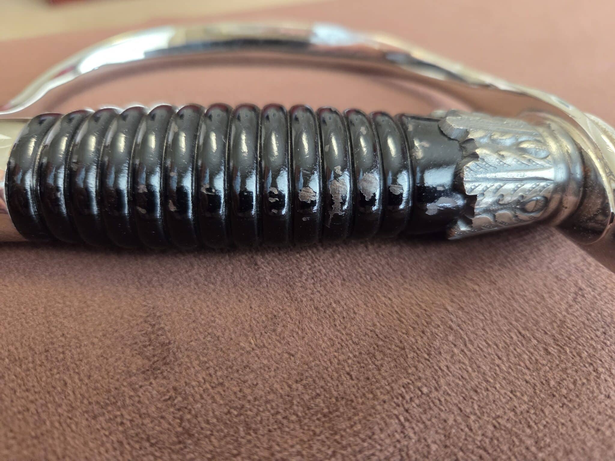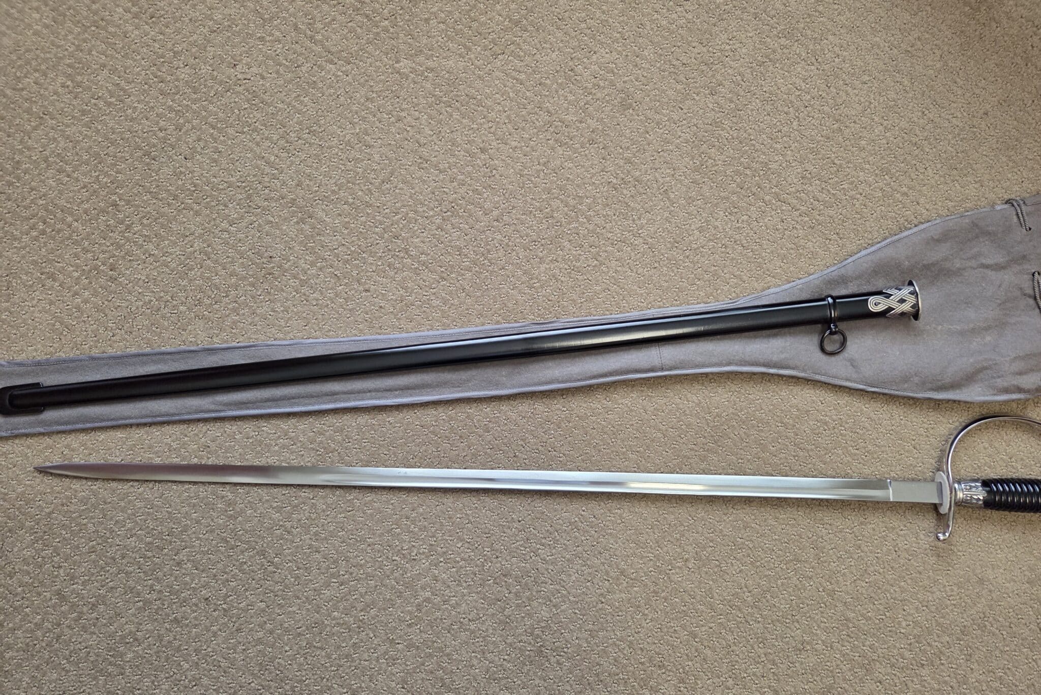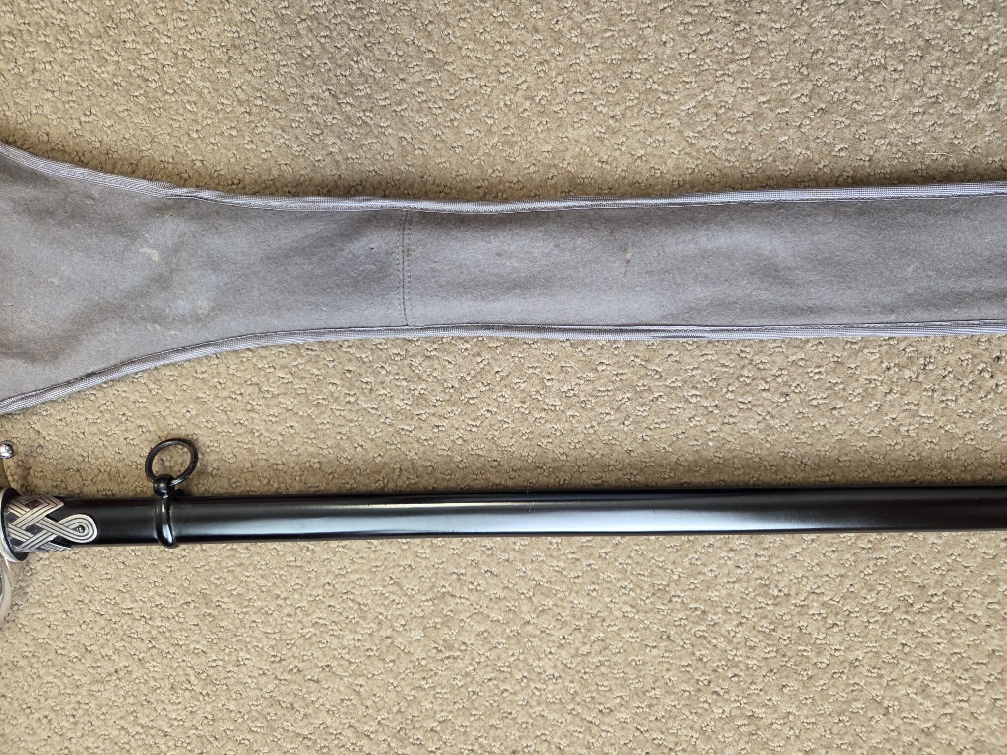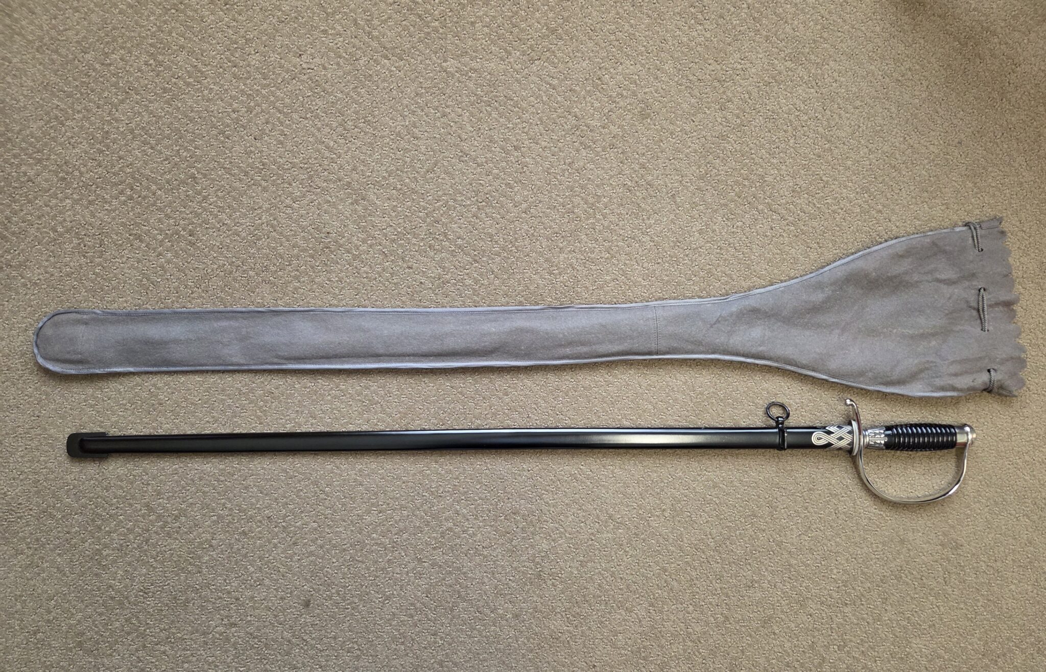 Pet. Dan. Krebs Solingen around the sides of a shield w/a stamped crayfish inside shield TM. Nickel-plated hilt fittings show no wear with no lifting or pitting to pommel, ferrule or knuckle-bow. Pommel cap, with raised cast SS Runes, retains 100% of the factory darkened background. Underside of crossguard is not SS proofmarked. Black wooden grip shows minor surface wear to black factory finish on highlights of several grip swirls, but no cracks or chips. Polished, straight, matte finished blade measuring 33” in length grades MINT showing no wear, graying, pitting or nicks to cutting edge and is complete with white leather blade buffer pad. Dent-free steel scabbard retains approximately 99% of the original black enamel with only a few tiny surface scratches, but no crazing or lifting to paint. Nickel-plated upper scabbard fitting shows minor age with virtually 100% of the black enamel in the recesses of the scrollwork design. Scabbard throat is SS proofmarked. Sword is complete with original mouse gray felt storage bag with minor mothing, but no rips, tears or repairs, and is complete with original tie string. NOTE: JRB&M has not and will not dissemble the sword to inspect for internal markings. Superb original combination and one of the finest SS NCO Swords JRB&M has ever offered. Near MINT/MINT