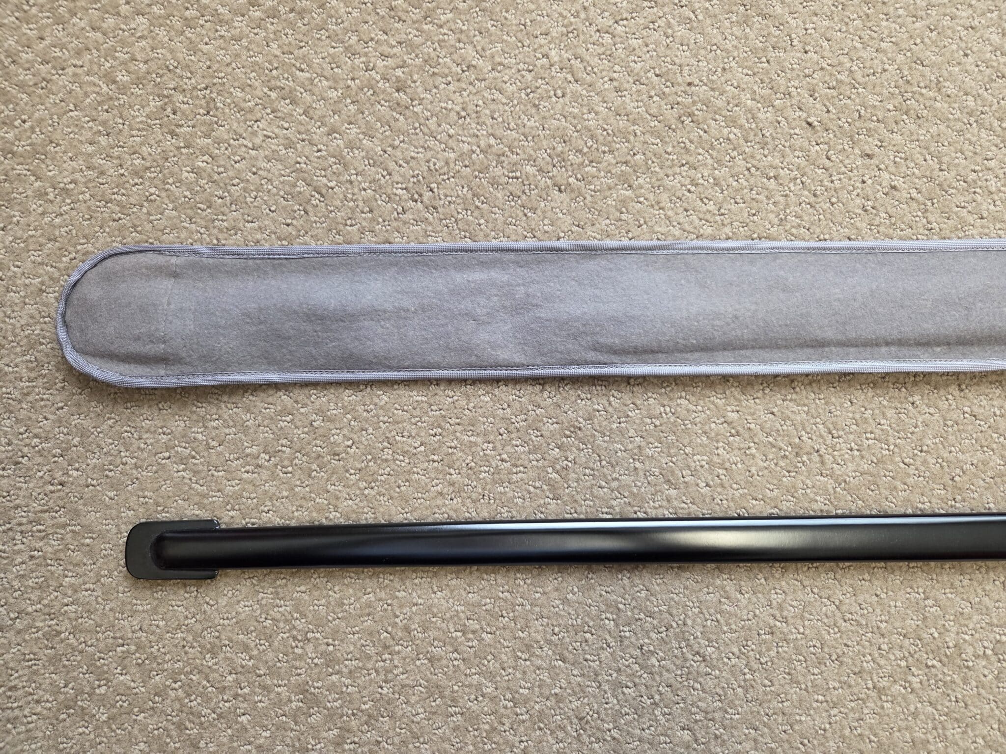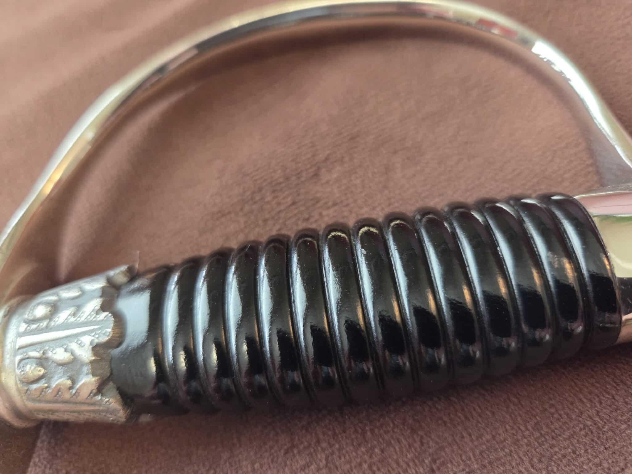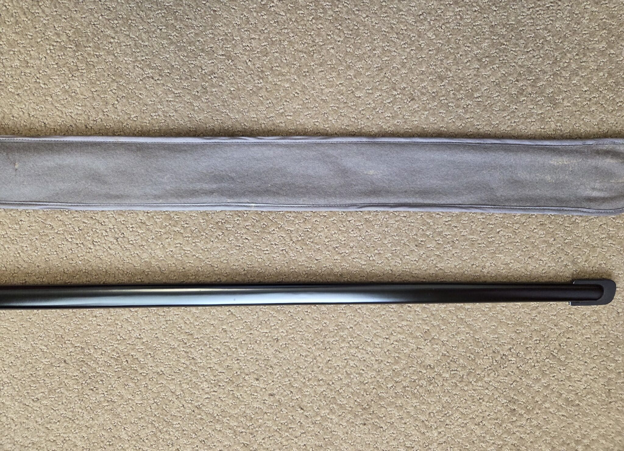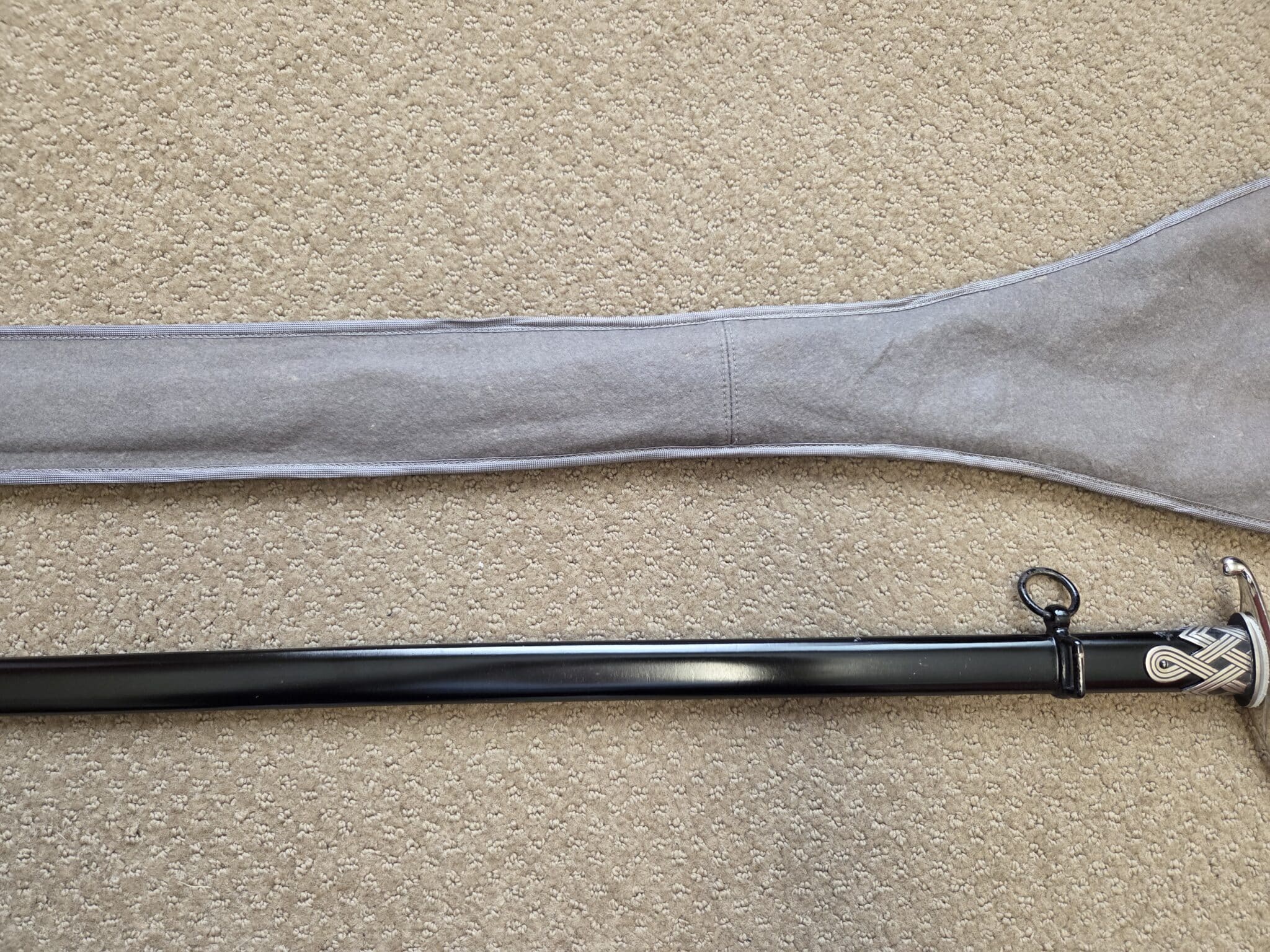 Pet. Dan. Krebs Solingen around the sides of a shield w/a stamped crayfish inside shield TM. Nickel-plated hilt fittings show no wear with no lifting or pitting to pommel, ferrule or knuckle-bow. Pommel cap, with raised cast SS Runes, retains 100% of the factory darkened background. Underside of crossguard is not SS proofmarked. Black wooden grip shows minor surface wear to black factory finish on highlights of several grip swirls, but no cracks or chips. Polished, straight, matte finished blade measuring 33” in length grades MINT showing no wear, graying, pitting or nicks to cutting edge and is complete with white leather blade buffer pad. Dent-free steel scabbard retains approximately 99% of the original black enamel with only a few tiny surface scratches, but no crazing or lifting to paint. Nickel-plated upper scabbard fitting shows minor age with virtually 100% of the black enamel in the recesses of the scrollwork design. Scabbard throat is SS proofmarked. Sword is complete with original mouse gray felt storage bag with minor mothing, but no rips, tears or repairs, and is complete with original tie string. NOTE: JRB&M has not and will not dissemble the sword to inspect for internal markings. Superb original combination and one of the finest SS NCO Swords JRB&M has ever offered. Near MINT/MINT