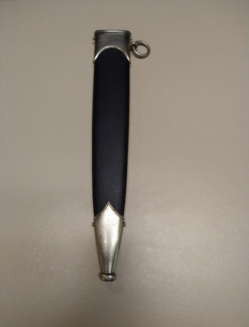 Black painted and retaining 99% of its paint. Complete with the nickel/silver scabbard fittings, 0-ring, and 4 scabbard screws. The fittings show normal wear with light nicks on the lower fitting and the tip of the ball is smashed in.
