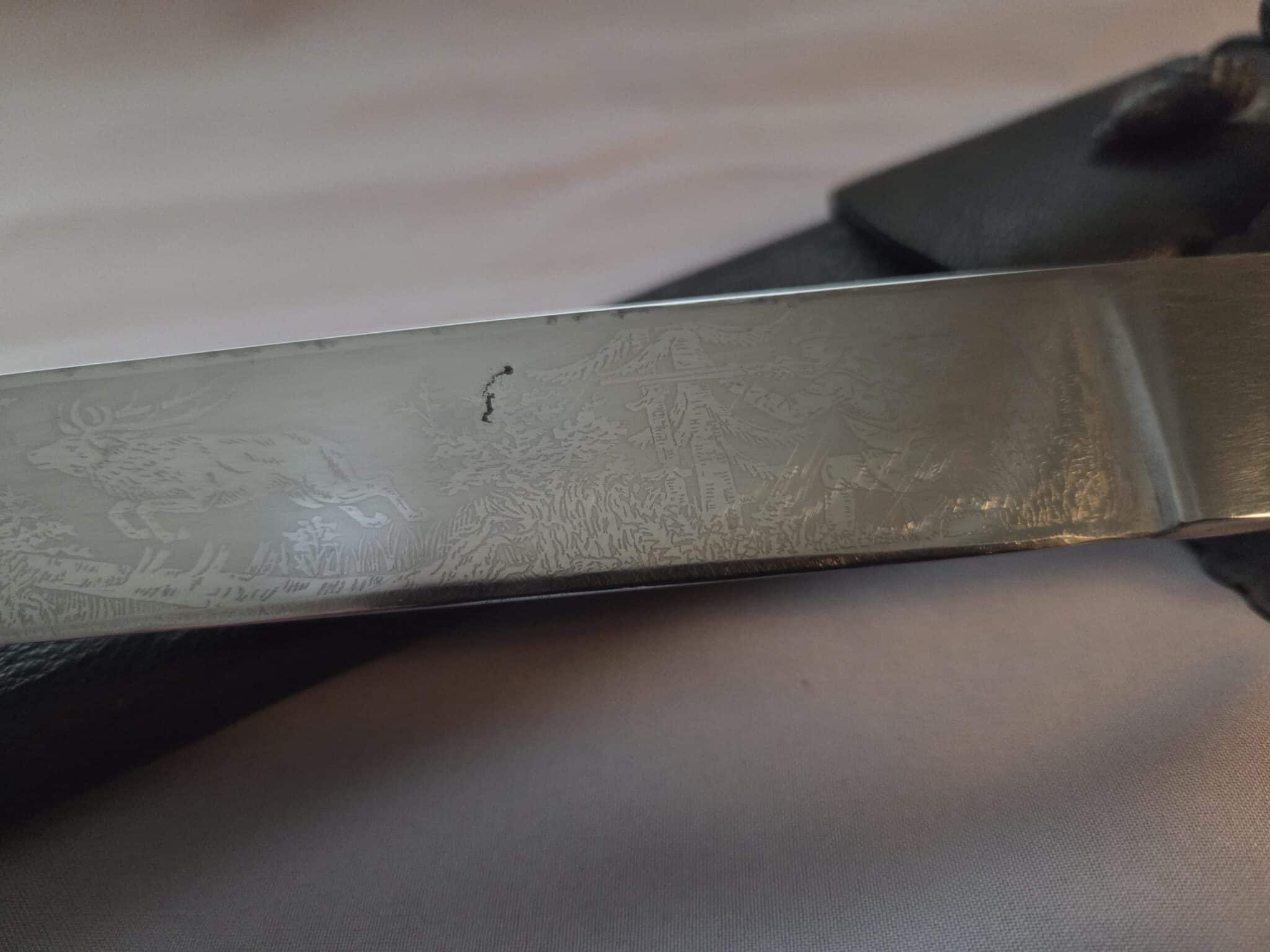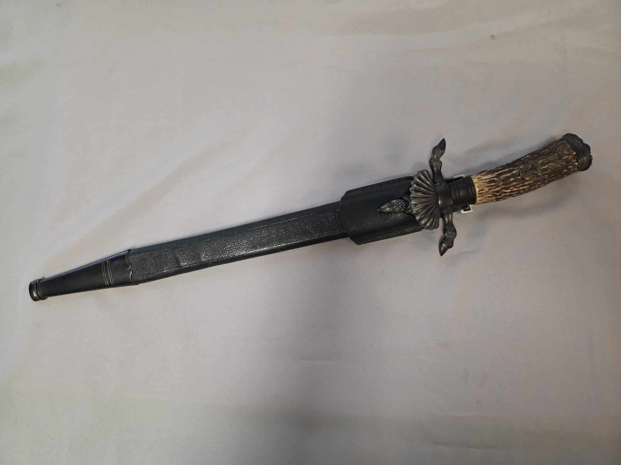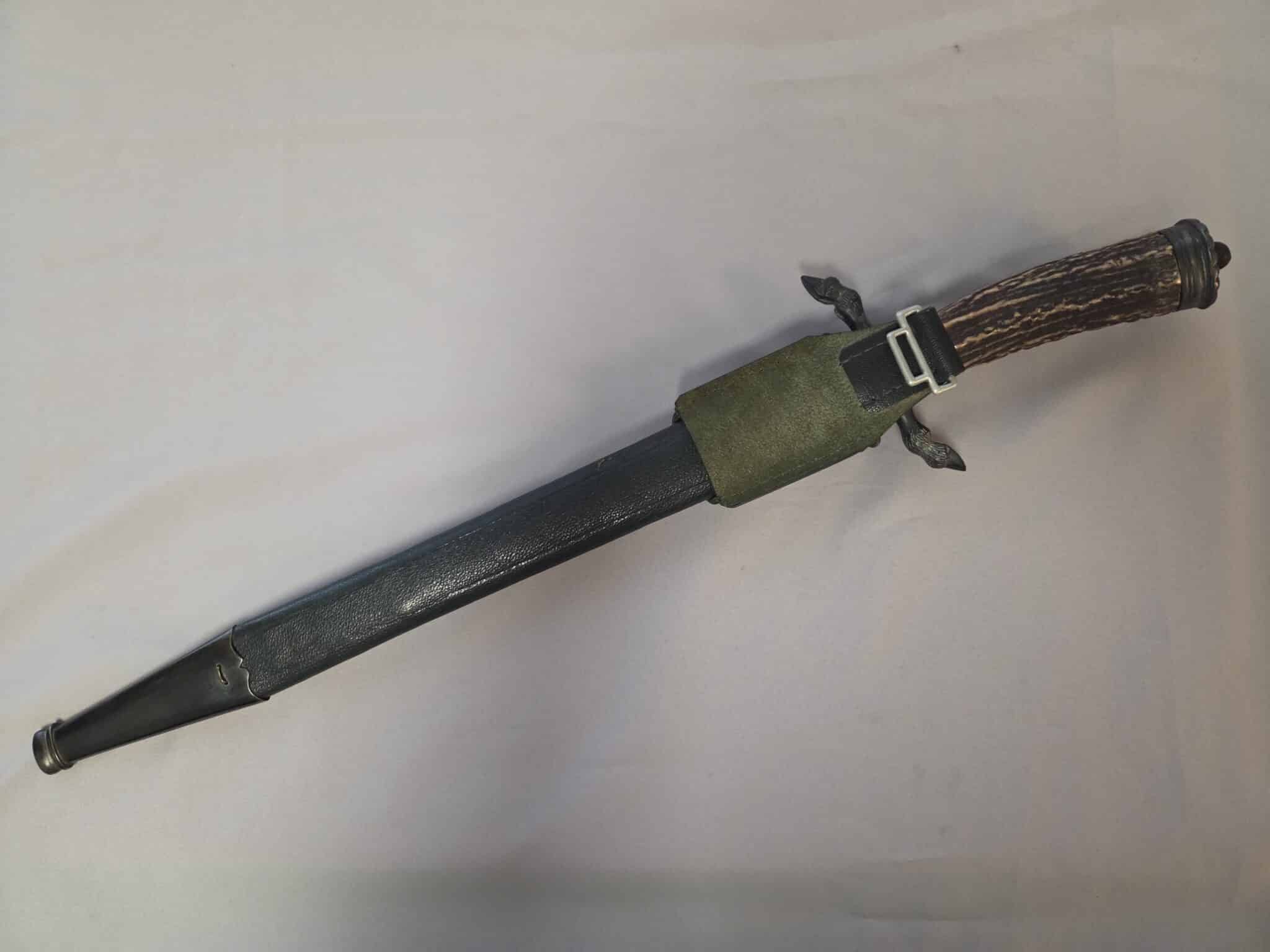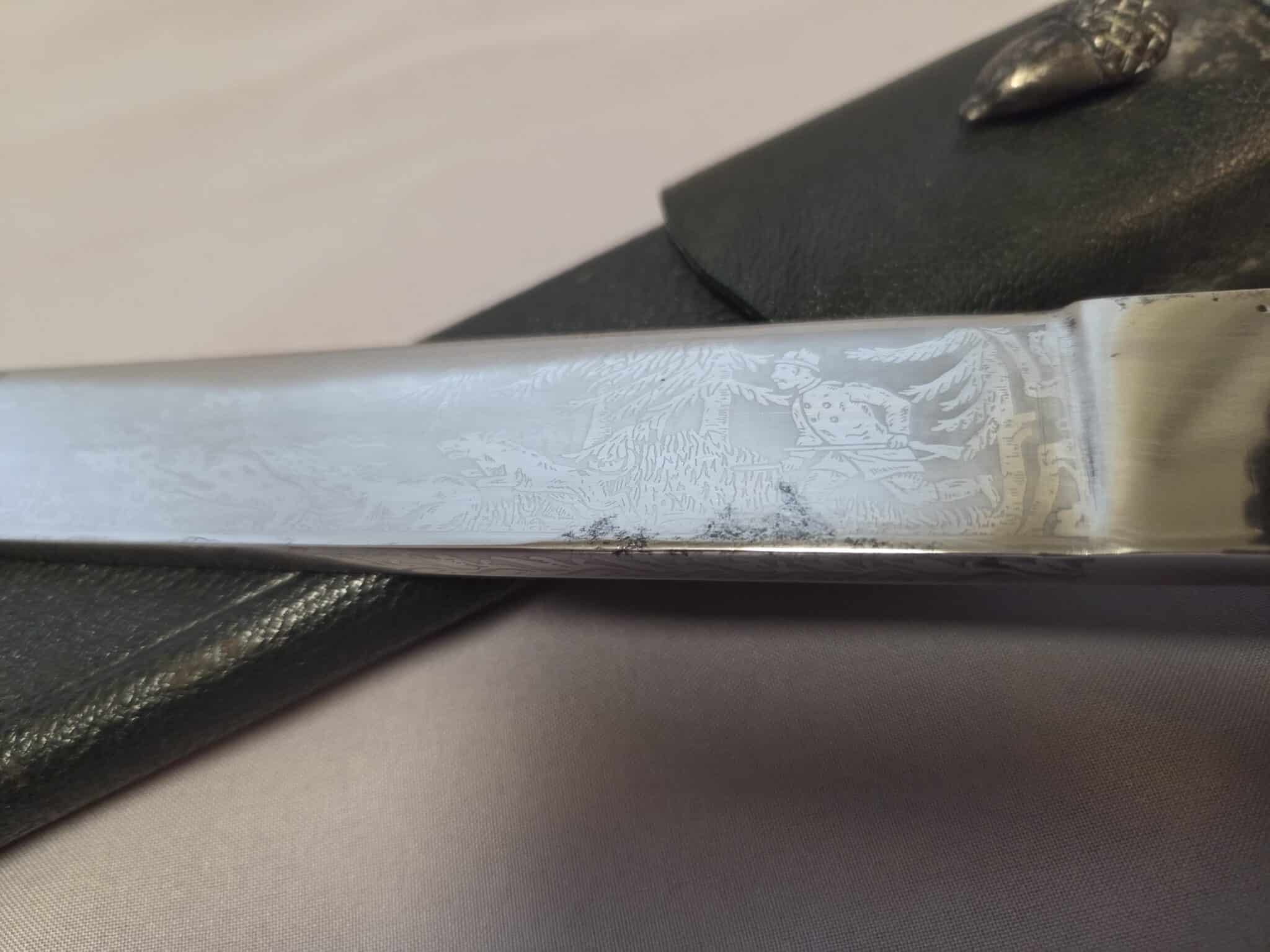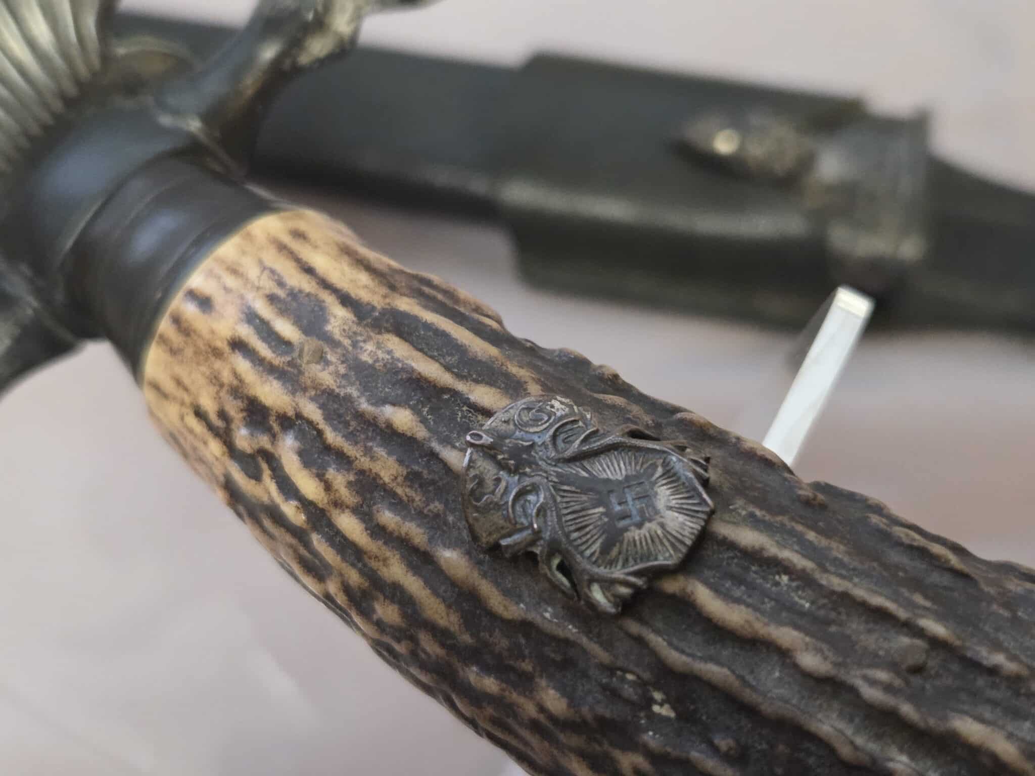 No maker. Double-etched blade features various hunting scenes and has some speckling/graying on both sides. The tip of the blade remains at a point. The large stag grip has a well detailed Hunting Association emblem with swastika. Hilt and scabbard fittings have a dark patina. Staple is intact on the lower scabbard fitting. Black leather scabbard has a couple of indentations on both sides but overall, the leather is in EXC+/EXC++ condition. Complete with black leather frog in MINT condition.