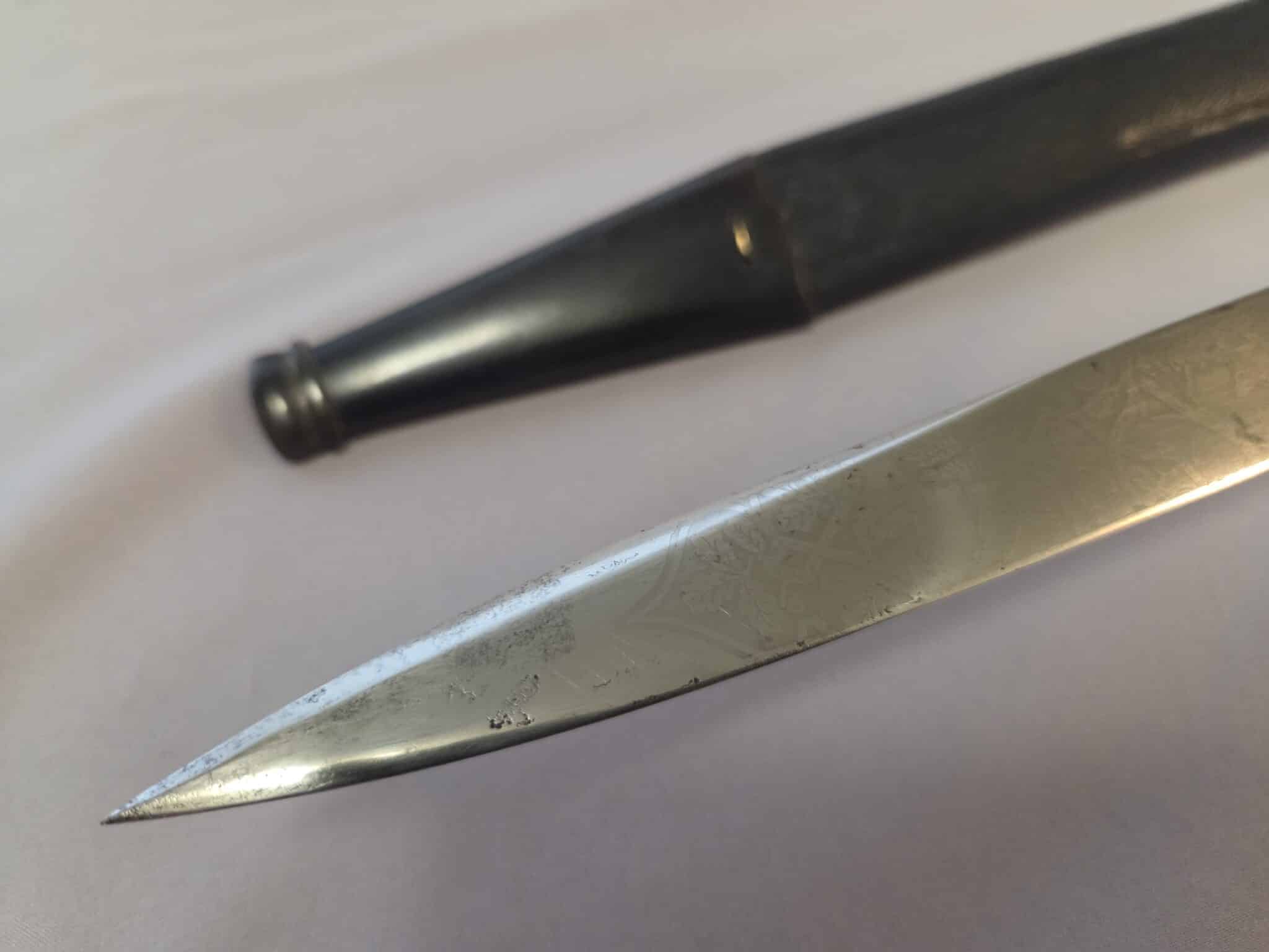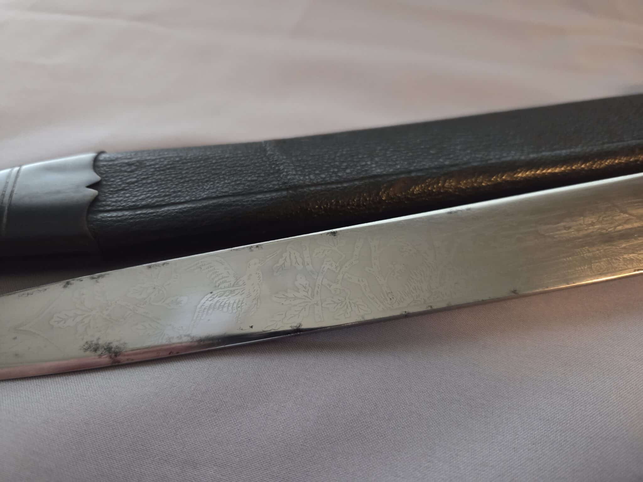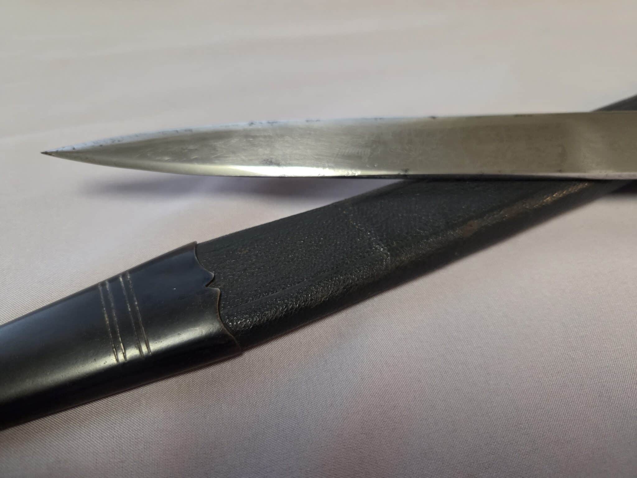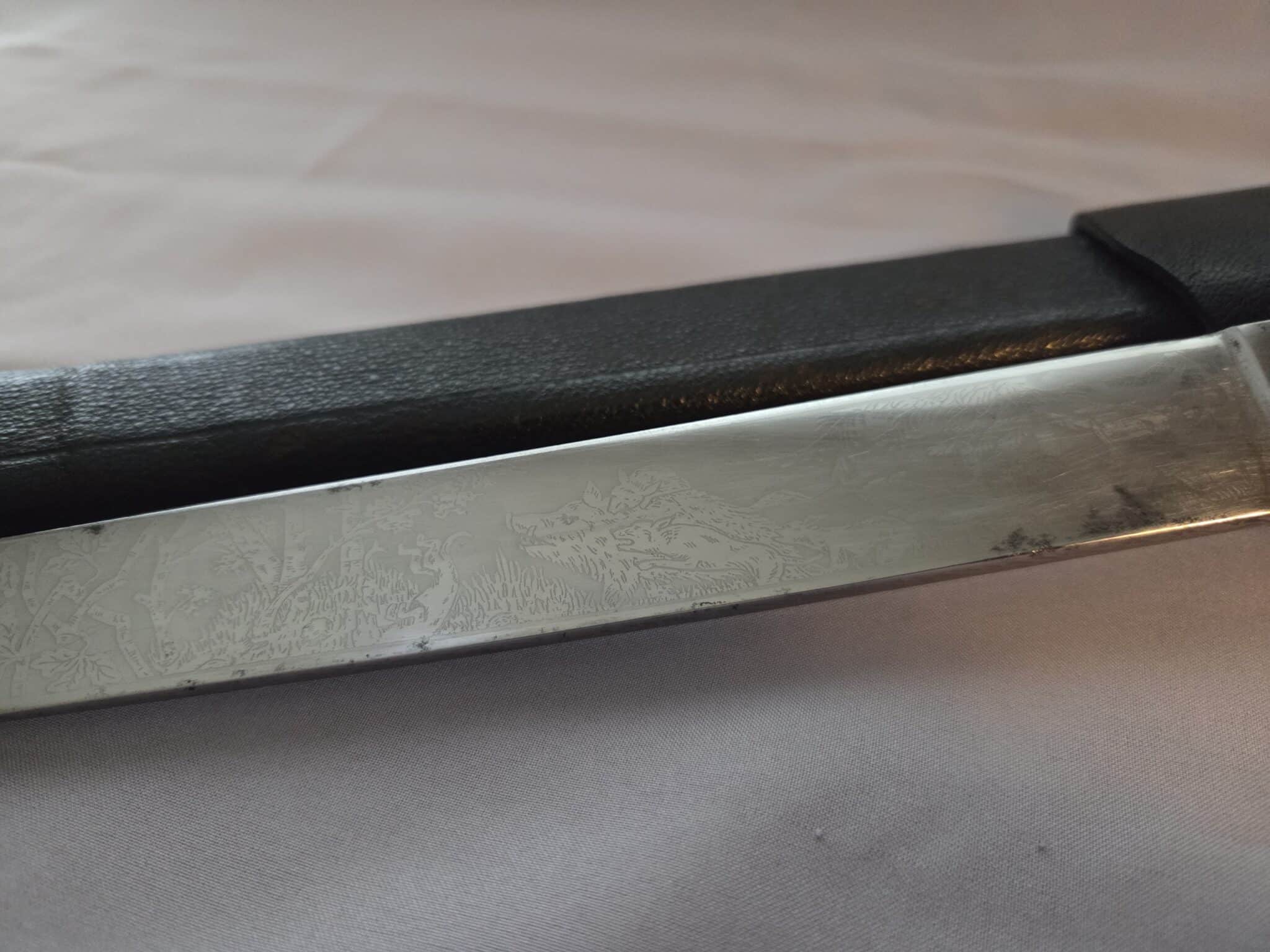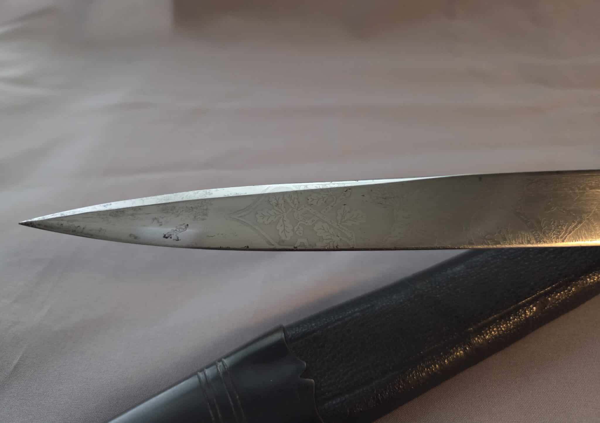 No maker. Double-etched blade features various hunting scenes and has some speckling/graying on both sides. The tip of the blade remains at a point. The large stag grip has a well detailed Hunting Association emblem with swastika. Hilt and scabbard fittings have a dark patina. Staple is intact on the lower scabbard fitting. Black leather scabbard has a couple of indentations on both sides but overall, the leather is in EXC+/EXC++ condition. Complete with black leather frog in MINT condition.
