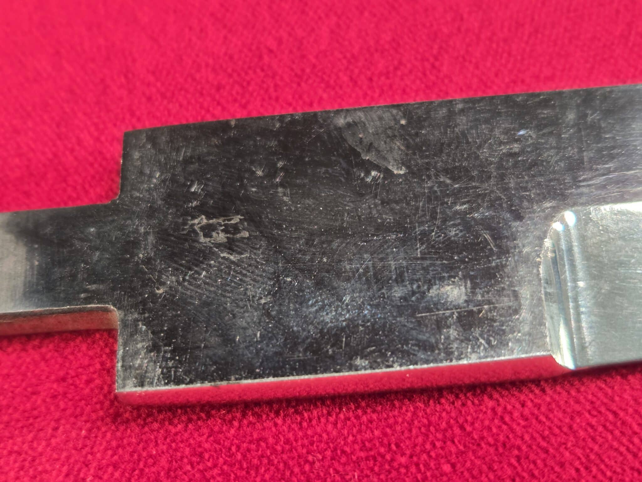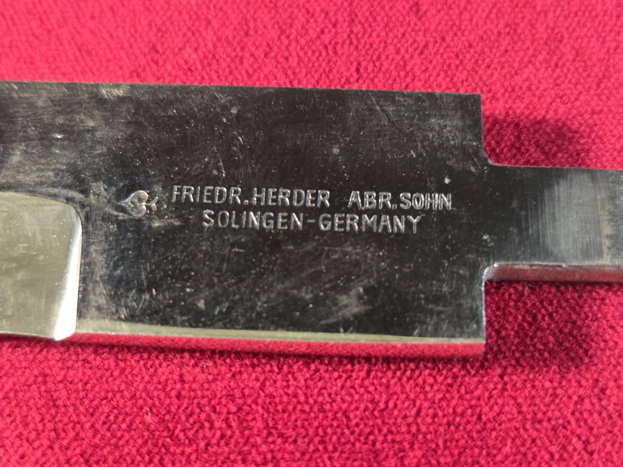 An original short/KS/98 bayonet Herder blade with spade trademark; 7 1/4″ length. Believe to have been removed from the factory where it had been stored for many years and obtained by JRB in Germany. The blade does not have a threaded tang.